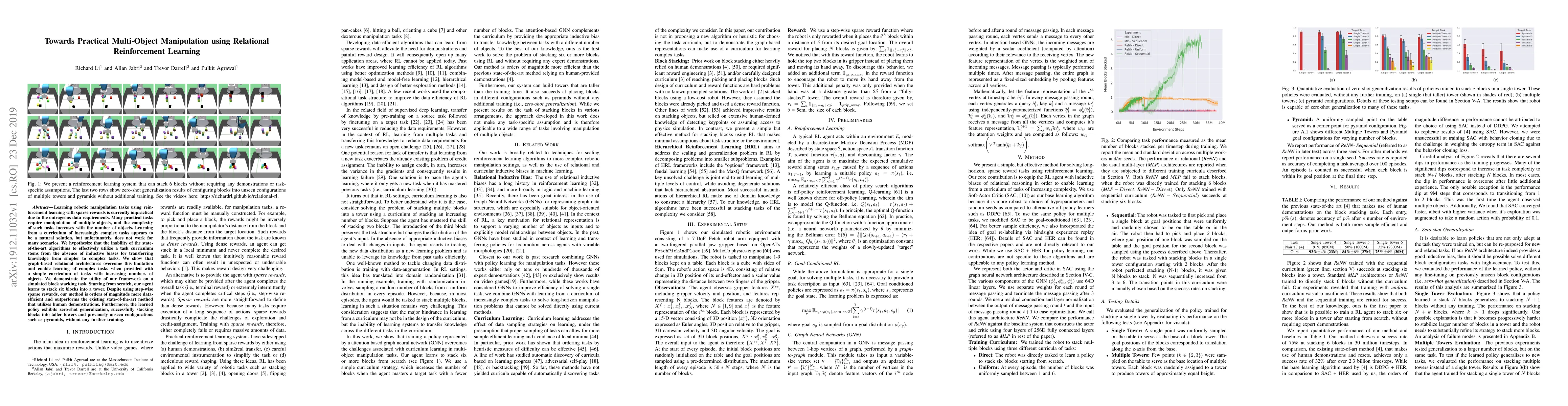 This paper proposes a graph-based relational reinforcement learning approach to enable practical multi-object manipulation tasks, demonstrating significant data efficiency and zero-shot generalization in a simulated block stacking task. The method effectively transfers knowledge from simpler to more complex tasks, overcoming the limitations of existing algorithms.