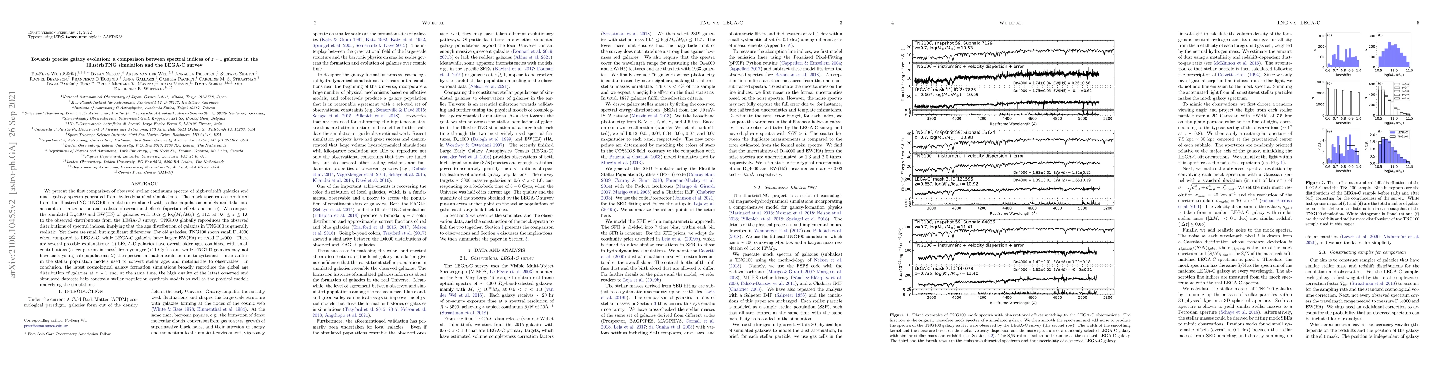This paper compares spectral indices of $z\sim1$ galaxies from the IllustrisTNG simulation with observations from the LEGA-C survey, finding that the simulation broadly reproduces the observed age distribution but shows small discrepancies, particularly in older galaxies, suggesting potential issues in stellar population models or the presence of young stellar sub-populations in observations.
