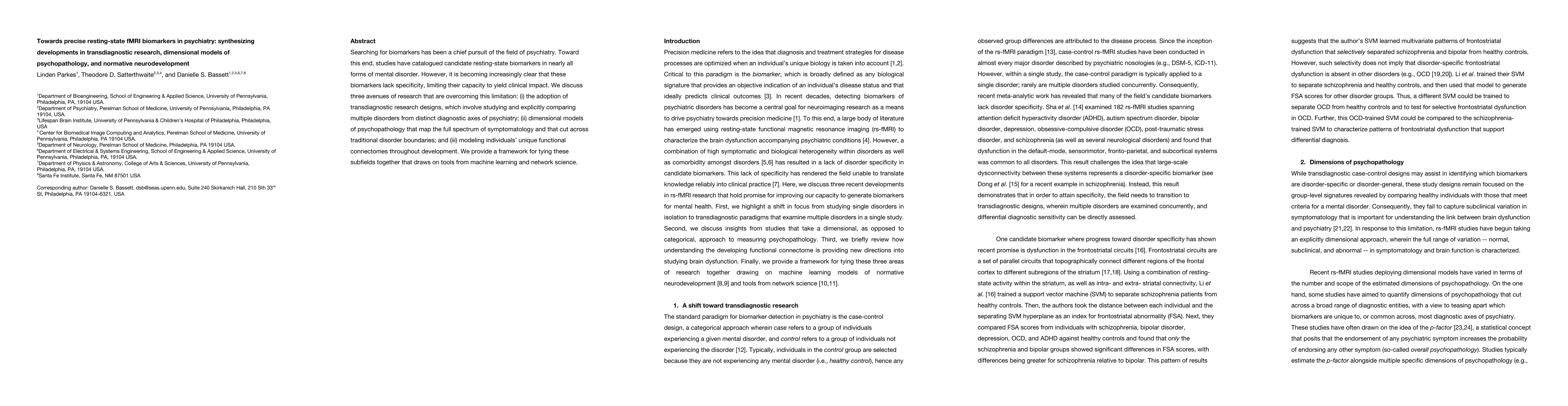 This paper explores the development of precise resting-state fMRI biomarkers for psychiatry by integrating transdiagnostic research, dimensional models of psychopathology, and normative neurodevelopment. It proposes a framework combining machine learning and network science to enhance specificity and clinical impact of these biomarkers.