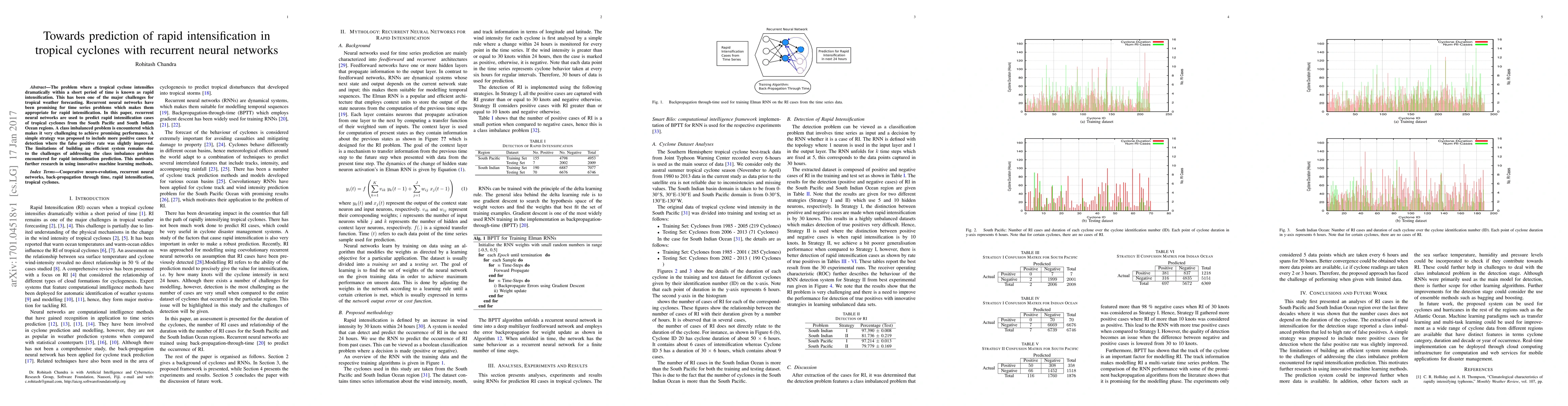 This paper explores the use of recurrent neural networks to predict rapid intensification in tropical cyclones, focusing on South Pacific and South Indian Ocean regions. Despite addressing the class imbalance issue with a simple strategy, the study highlights the ongoing challenges in achieving optimal performance, underscoring the need for further research in advanced machine learning techniques.