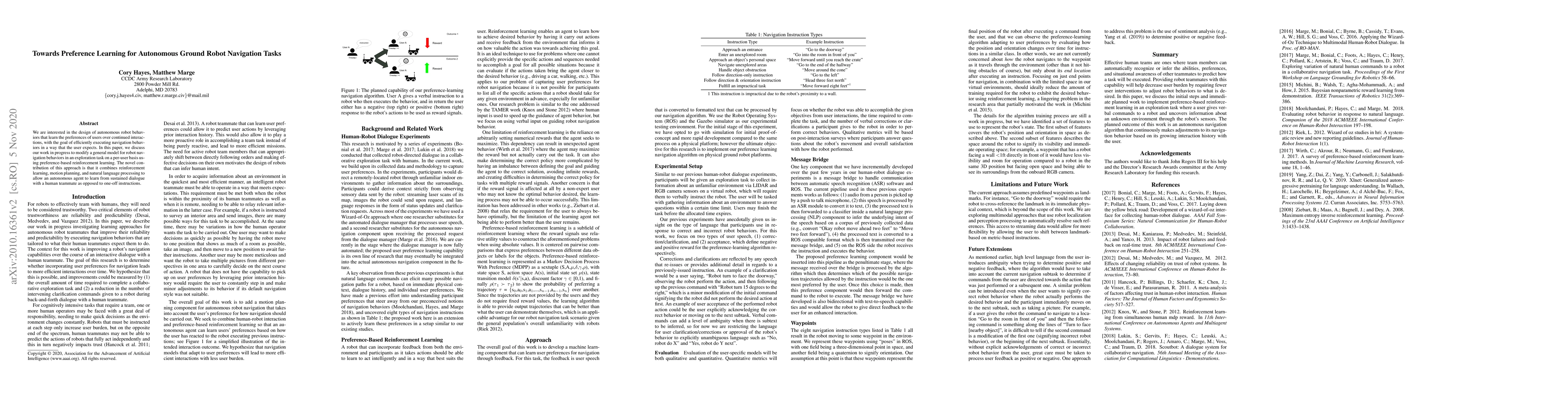 We are interested in the design of autonomous robot behaviors that learn the preferences of users over continued interactions, with the goal of efficiently executing navigation behaviors in a way that the user expects. In this paper, we discuss our work in progress to modify a general model for robot navigation behaviors in an exploration task on a per-user basis using preference-based reinforcement learning. The novel contribution of this approach is that it combines reinforcement learning, motion planning, and natural language processing to allow an autonomous agent to learn from sustained dialogue with a human teammate as opposed to one-off instructions.