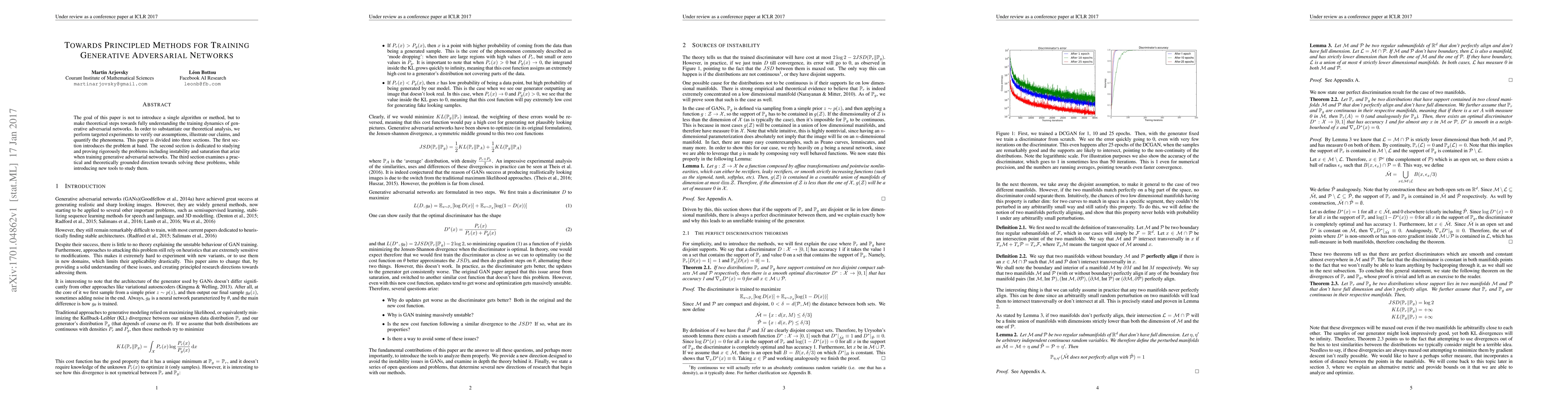 The goal of this paper is not to introduce a single algorithm or method, but to make theoretical steps towards fully understanding the training dynamics of generative adversarial networks. In order to substantiate our theoretical analysis, we perform targeted experiments to verify our assumptions, illustrate our claims, and quantify the phenomena. This paper is divided into three sections. The first section introduces the problem at hand. The second section is dedicated to studying and proving rigorously the problems including instability and saturation that arize when training generative adversarial networks. The third section examines a practical and theoretically grounded direction towards solving these problems, while introducing new tools to study them.