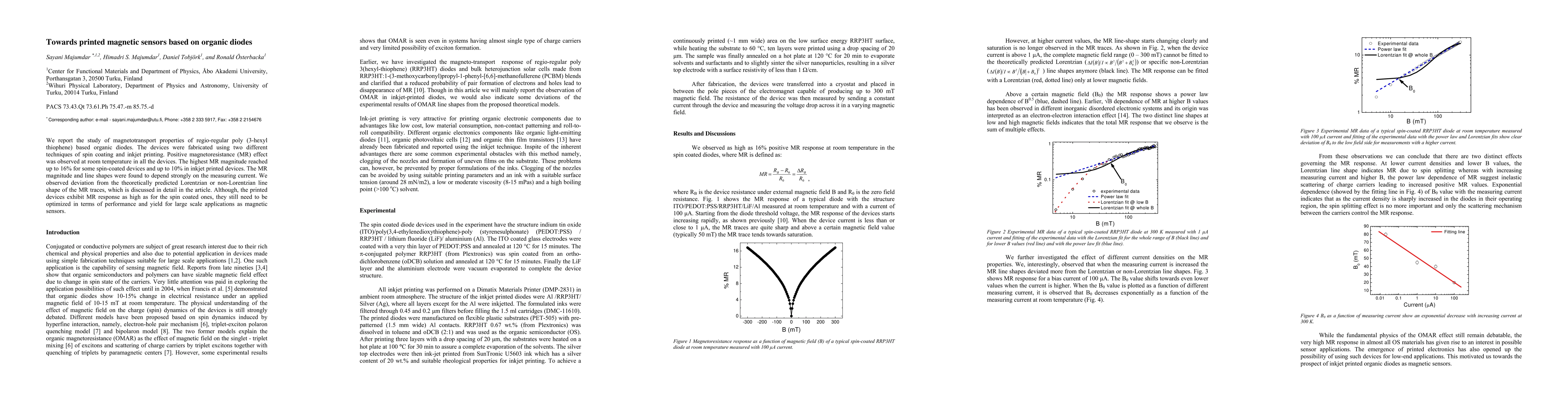 The research observed the OMAR effect in polymeric diodes fabricated by spin coating and inkjet printing, with high enough MR recorded.
