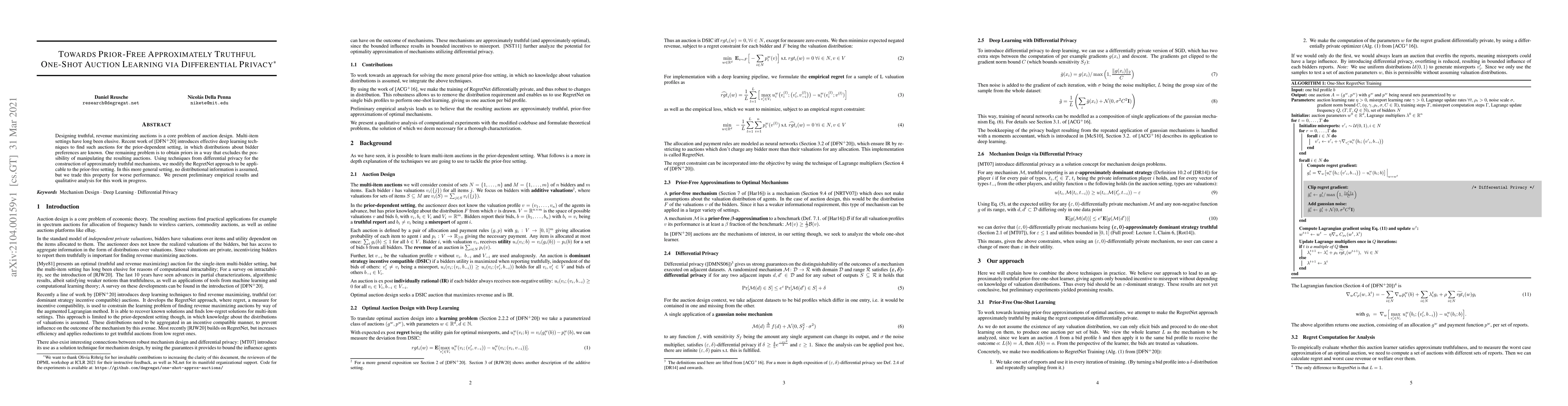 The paper's main technical contribution is the modification of the RegretNet approach to incorporate differential privacy, enabling a prior-free, approximately truthful one-shot auction learner.