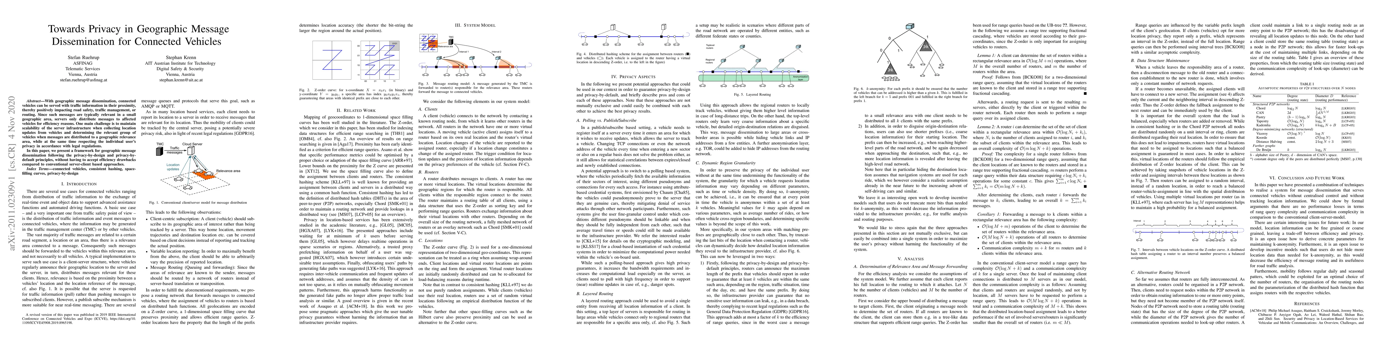 With geographic message dissemination, connected vehicles can be served with traffic information in their proximity, thereby positively impacting road safety, traffic management, or routing. Since such messages are typically relevant in a small geographic area, servers only distribute messages to affected vehicles for efficiency reasons. One main challenge is to maintain scalability of the server infrastructure when collecting location updates from vehicles and determining the relevant group of vehicles when messages are distributed to a geographic relevance area, while at the same time respecting the individual user's privacy in accordance with legal regulations. In this paper, we present a framework for geographic message dissemination following the privacy-by-design and privacy-by-default principles, without having to accept efficiency drawbacks compared to conventional server-client based approaches.