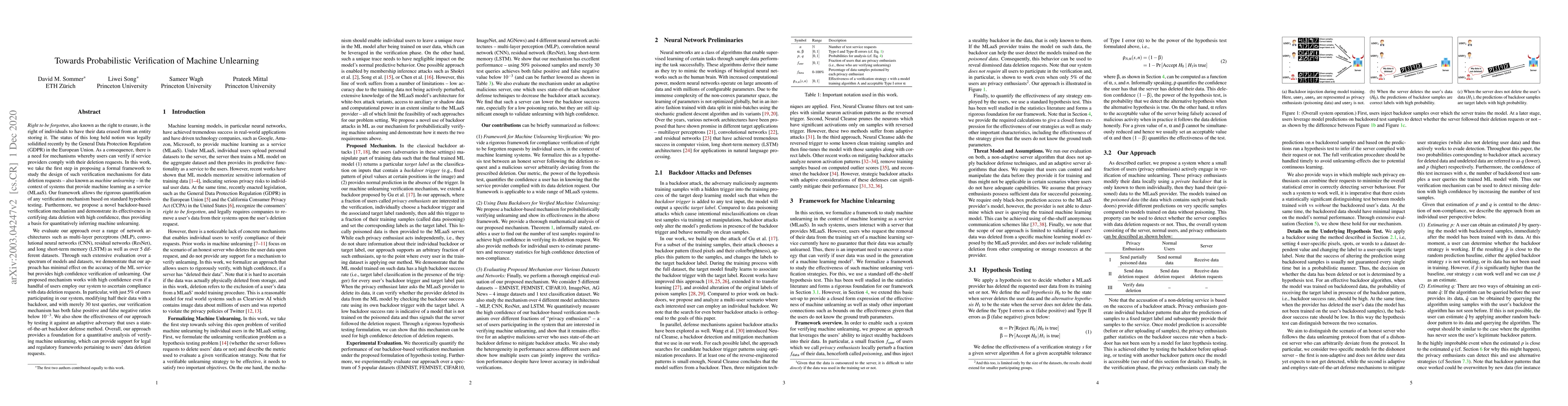 This paper proposes a probabilistic framework for verifying machine unlearning, ensuring compliance with data erasure requests under GDPR. The authors introduce a novel backdoor-based verification mechanism that certifies data deletion with high confidence, demonstrating minimal impact on machine learning service accuracy while achieving low false positive and negative rates.