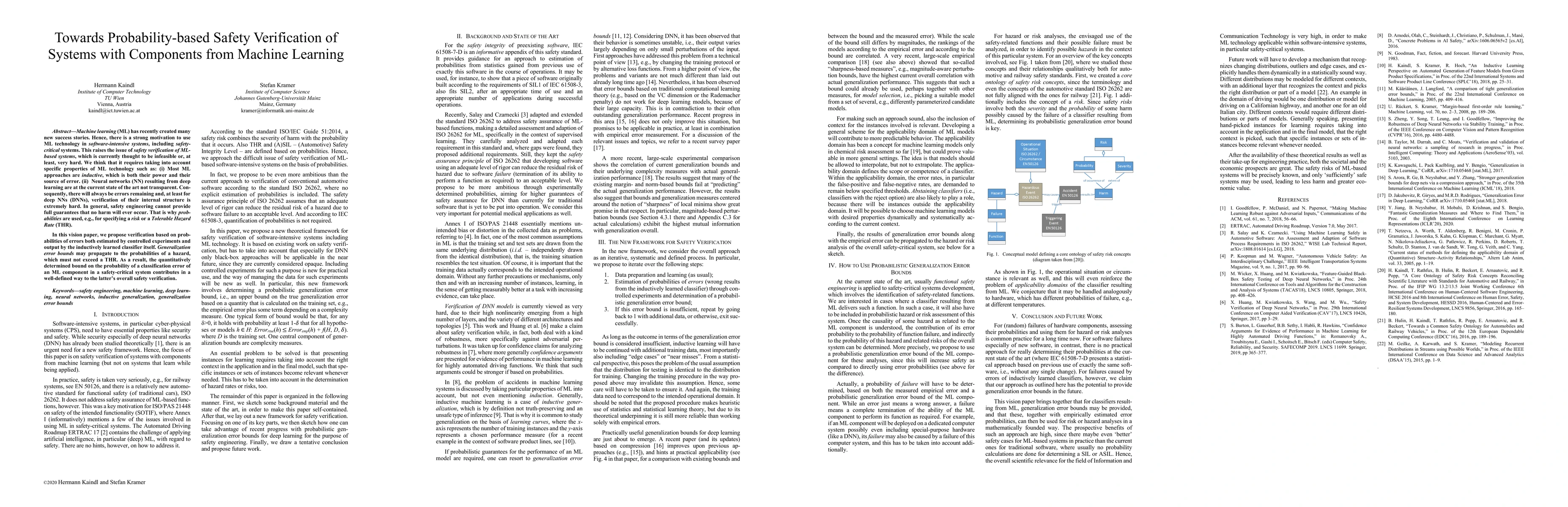 Machine learning (ML) has recently created many new success stories. Hence, there is a strong motivation to use ML technology in software-intensive systems, including safety-critical systems. This raises the issue of safety verification of MLbased systems, which is currently thought to be infeasible or, at least, very hard. We think that it requires taking into account specific properties of ML technology such as: (i) Most ML approaches are inductive, which is both their power and their source of error. (ii) Neural networks (NN) resulting from deep learning are at the current state of the art not transparent. Consequently, there will always be errors remaining and, at least for deep NNs (DNNs), verification of their internal structure is extremely hard. In general, safety engineering cannot provide full guarantees that no harm will ever occur. That is why probabilities are used, e.g., for specifying a risk or a Tolerable Hazard Rate (THR). In this vision paper, we propose verification based on probabilities of errors both estimated by controlled experiments and output by the inductively learned classifier itself. Generalization error bounds may propagate to the probabilities of a hazard, which must not exceed a THR. As a result, the quantitatively determined bound on the probability of a classification error of an ML component in a safety-critical system contributes in a well-defined way to the latter's overall safety verification.