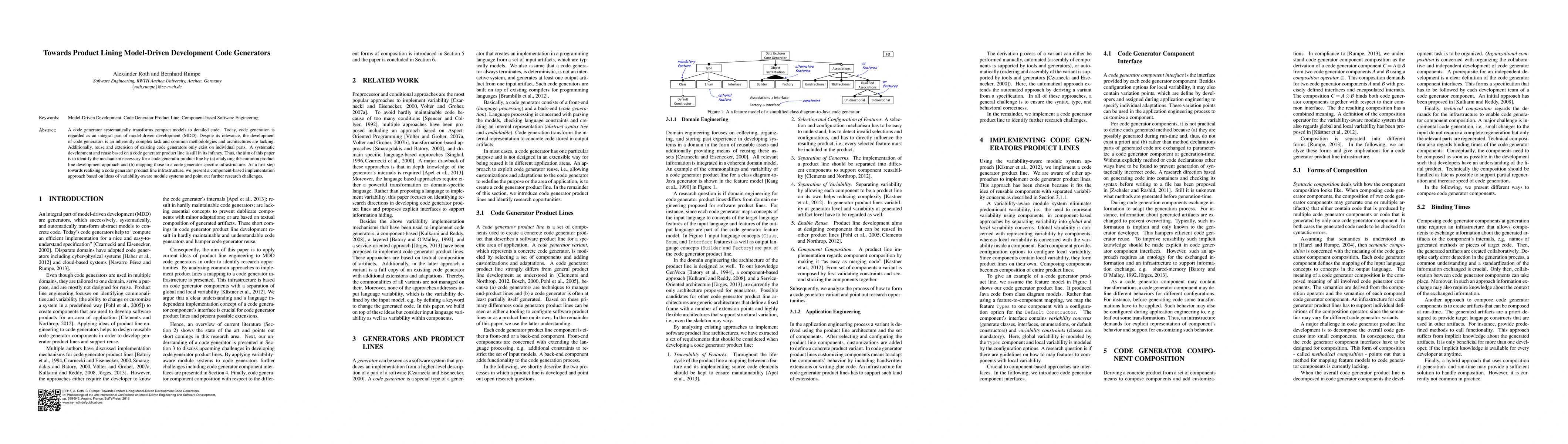 This paper explores the development of a systematic product line for code generators in model-driven development, proposing a component-based implementation approach. It identifies mechanisms for reuse and extension, highlighting the need for a structured infrastructure and outlining initial steps and future research challenges.
