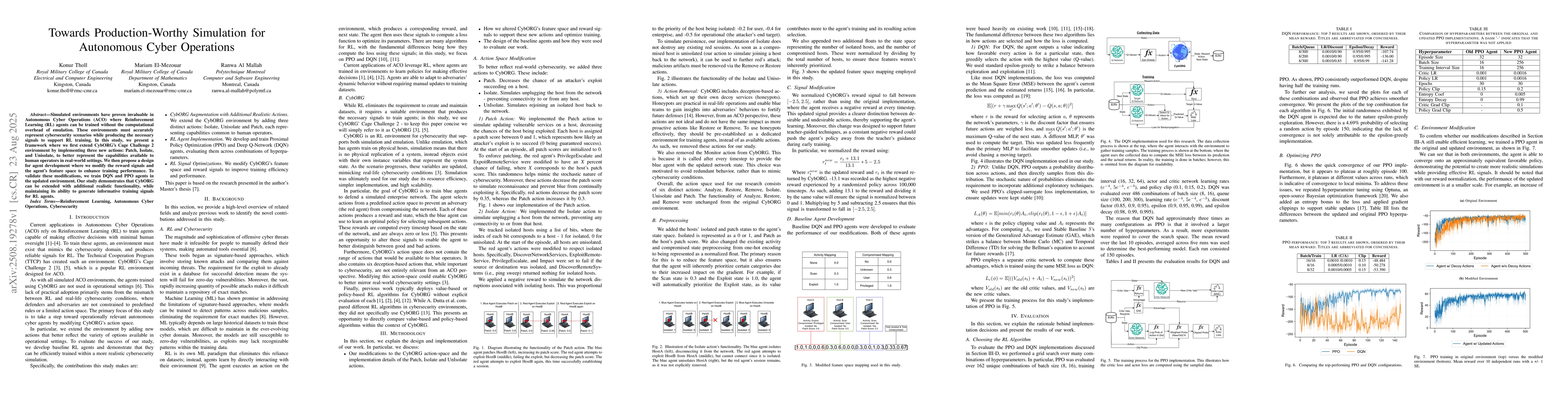 Simulated environments have proven invaluable in Autonomous Cyber Operations (ACO) where Reinforcement Learning (RL) agents can be trained without the computational overhead of emulation. These environments must accurately represent cybersecurity scenarios while producing the necessary signals to support RL training. In this study, we present a framework where we first extend CybORG's Cage Challenge 2 environment by implementing three new actions: Patch, Isolate, and Unisolate, to better represent the capabilities available to human operators in real-world settings. We then propose a design for agent development where we modify the reward signals and the agent's feature space to enhance training performance. To validate these modifications, we train DQN and PPO agents in the updated environment. Our study demonstrates that CybORG can be extended with additional realistic functionality, while maintaining its ability to generate informative training signals for RL agents.