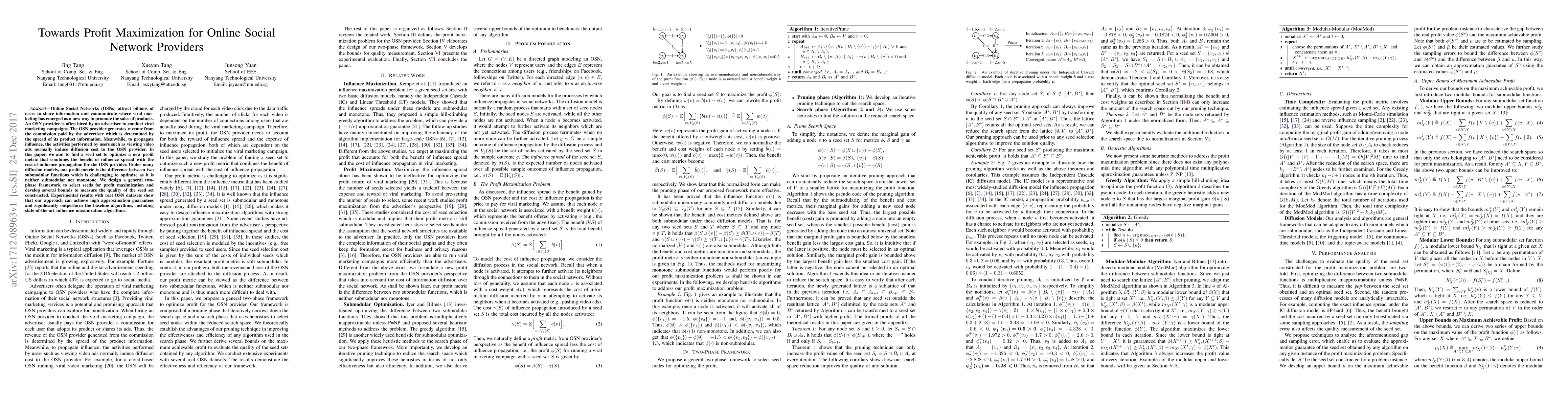 This paper proposes a framework to maximize profit for online social network providers by optimizing a new profit metric that balances the benefit of product influence spread against the cost of influence propagation. The authors develop a two-phase selection method for seed set optimization and demonstrate superior performance over baseline algorithms using real OSN data.