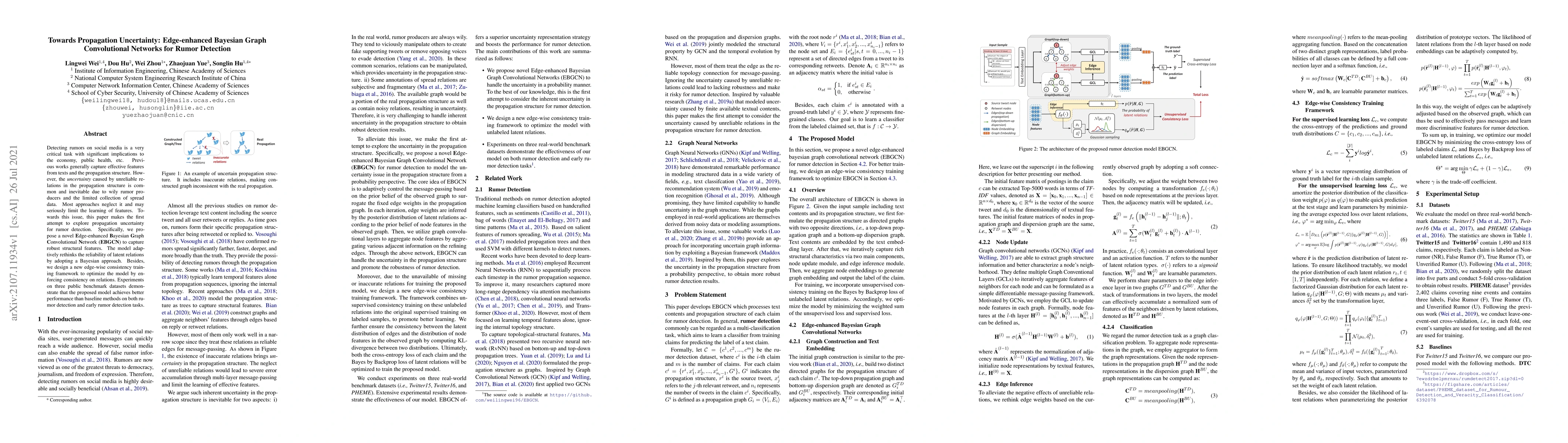This paper introduces an Edge-enhanced Bayesian Graph Convolutional Network (EBGCN) to address uncertainty in rumor detection on social media. The model captures robust structural features by adaptively assessing the reliability of propagation relations, leading to improved performance over baseline methods on rumor and early rumor detection tasks.