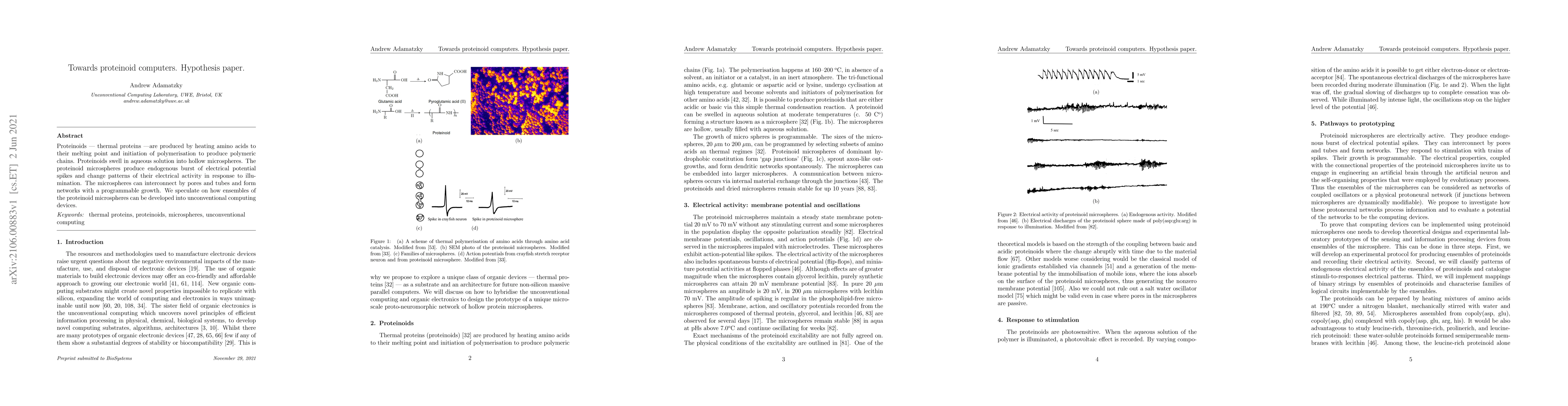 Proteinoids -- thermal proteins -- are produced by heating amino acids to their melting point and initiation of polymerisation to produce polymeric chains. Proteinoids swell in aqueous solution into hollow microspheres. The proteinoid microspheres produce endogenous burst of electrical potential spikes and change patterns of their electrical activity in response to illumination. The microspheres can interconnect by pores and tubes and form networks with a programmable growth. We speculate on how ensembles of the proteinoid microspheres can be developed into unconventional computing devices.