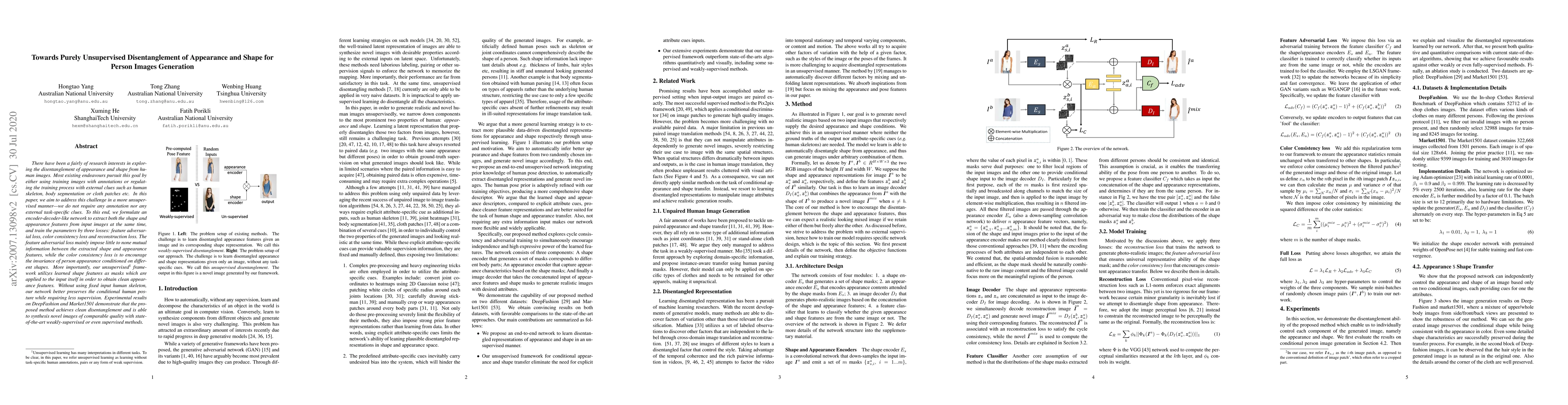 This paper introduces an unsupervised method for separating appearance and shape in human image data, using an encoder-decoder network with feature adversarial, color consistency, and reconstruction losses. The method generates high-quality, novel images without requiring annotations or external clues, outperforming many supervised and weakly-supervised alternatives on DeepFashion and Market1501 datasets.