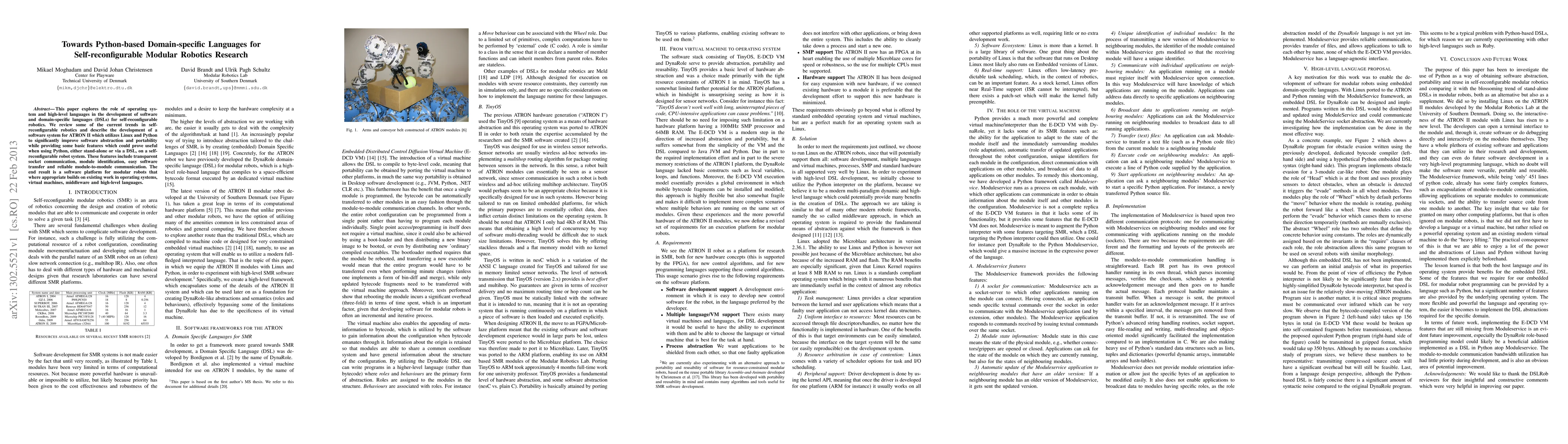 This paper investigates the development of Python-based domain-specific languages for self-reconfigurable modular robotics, highlighting the use of Linux and Python to enhance software abstraction and portability. The proposed system for ATRON II includes features like socket communication and module identification, aiming to improve the functionality of modular robot systems.