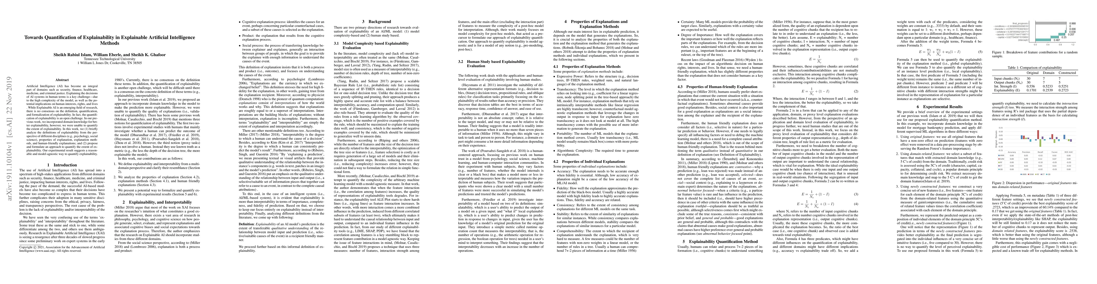 Artificial Intelligence (AI) has become an integral part of domains such as security, finance, healthcare, medicine, and criminal justice. Explaining the decisions of AI systems in human terms is a key challenge--due to the high complexity of the model, as well as the potential implications on human interests, rights, and lives . While Explainable AI is an emerging field of research, there is no consensus on the definition, quantification, and formalization of explainability. In fact, the quantification of explainability is an open challenge. In our previous work, we incorporated domain knowledge for better explainability, however, we were unable to quantify the extent of explainability. In this work, we (1) briefly analyze the definitions of explainability from the perspective of different disciplines (e.g., psychology, social science), properties of explanation, explanation methods, and human-friendly explanations; and (2) propose and formulate an approach to quantify the extent of explainability. Our experimental result suggests a reasonable and model-agnostic way to quantify explainability