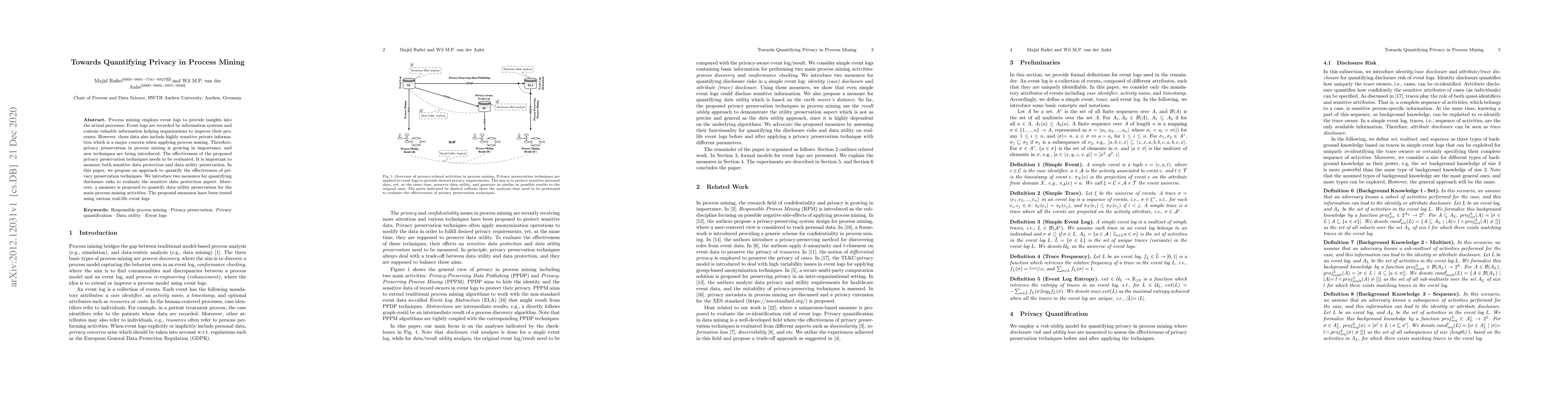 This paper proposes new measures to quantify the effectiveness of privacy preservation techniques in process mining. It introduces metrics to assess both the protection of sensitive data and the preservation of data utility, and validates these measures using real-life event logs.