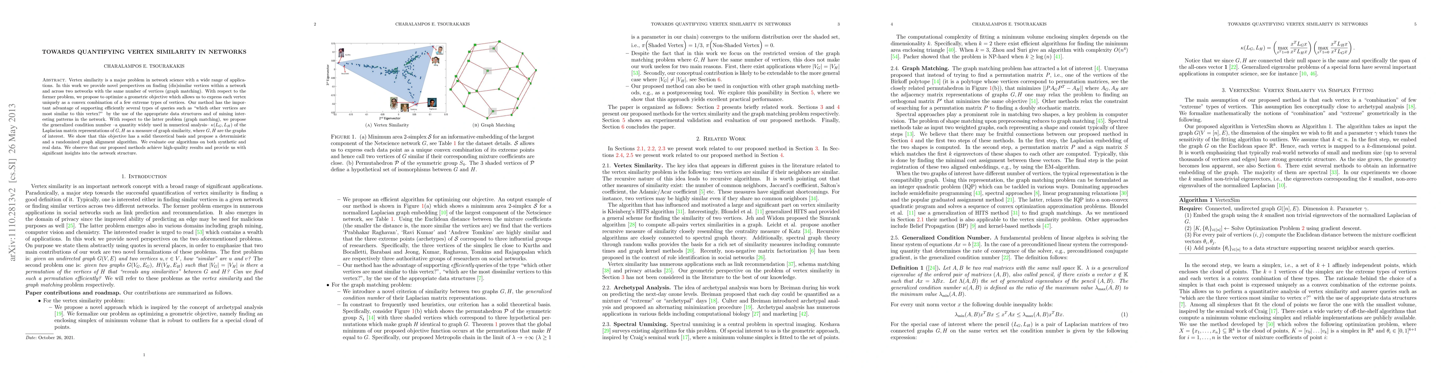 Vertex similarity is a major problem in network science with a wide range of applications. In this work we provide novel perspectives on finding (dis)similar vertices within a network and across two networks with the same number of vertices (graph matching). With respect to the former problem, we propose to optimize a geometric objective which allows us to express each vertex uniquely as a convex combination of a few extreme types of vertices. Our method has the important advantage of supporting efficiently several types of queries such as "which other vertices are most similar to this vertex?" by the use of the appropriate data structures and of mining interesting patterns in the network. With respect to the latter problem (graph matching), we propose the generalized condition number --a quantity widely used in numerical analysis-- $\kappa(L_G,L_H)$ of the Laplacian matrix representations of $G,H$ as a measure of graph similarity, where $G,H$ are the graphs of interest. We show that this objective has a solid theoretical basis and propose a deterministic and a randomized graph alignment algorithm. We evaluate our algorithms on both synthetic and real data. We observe that our proposed methods achieve high-quality results and provide us with significant insights into the network structure.
