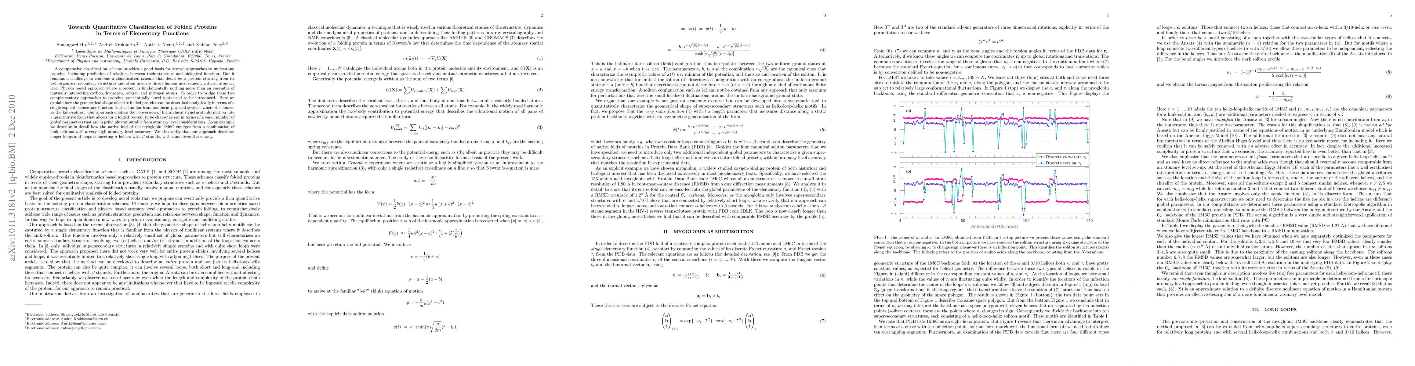 A comparative classification scheme provides a good basis for several approaches to understand proteins, including prediction of relations between their structure and biological function. But it remains a challenge to combine a classification scheme that describes a protein starting from its well organized secondary structures and often involves direct human involvement, with an atomary level Physics based approach where a protein is fundamentally nothing more than an ensemble of mutually interacting carbon, hydrogen, oxygen and nitrogen atoms. In order to bridge these two complementary approaches to proteins, conceptually novel tools need to be introduced. Here we explain how the geometrical shape of entire folded proteins can be described analytically in terms of a single explicit elementary function that is familiar from nonlinear physical systems where it is known as the kink-soliton. Our approach enables the conversion of hierarchical structural information into a quantitative form that allows for a folded protein to be characterized in terms of a small number of global parameters that are in principle computable from atomary level considerations. As an example we describe in detail how the native fold of the myoglobin 1M6C emerges from a combination of kink-solitons with a very high atomary level accuracy. We also verify that our approach describes longer loops and loops connecting $\alpha$-helices with $\beta$-strands, with same overall accuracy.