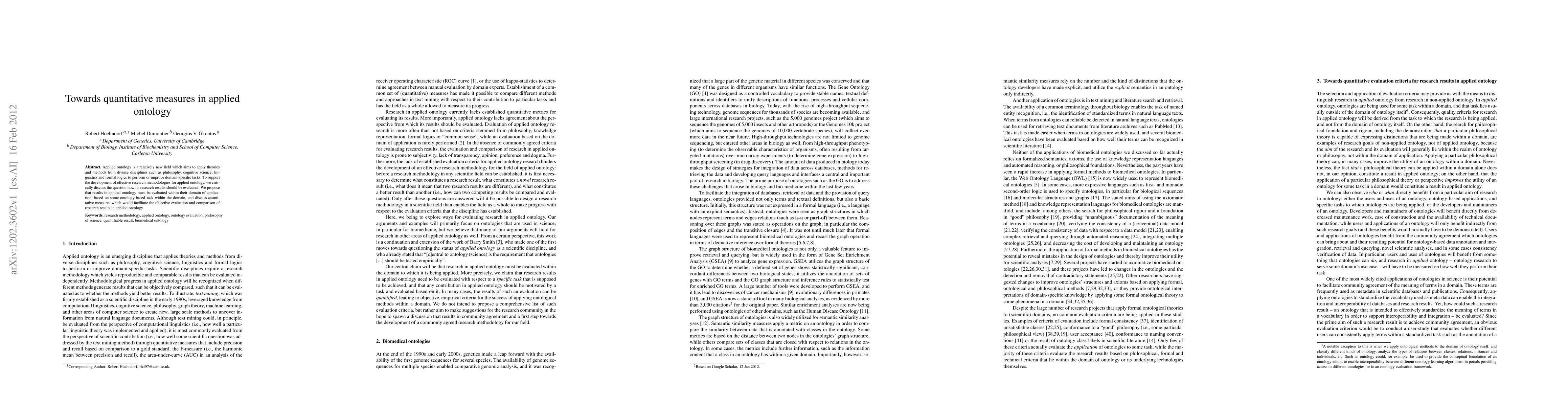 This paper explores the evaluation of research results in applied ontology, proposing that they should be assessed based on ontology-based tasks within their specific domains. It introduces quantitative measures to facilitate objective evaluation and comparison of applied ontology research outcomes.
