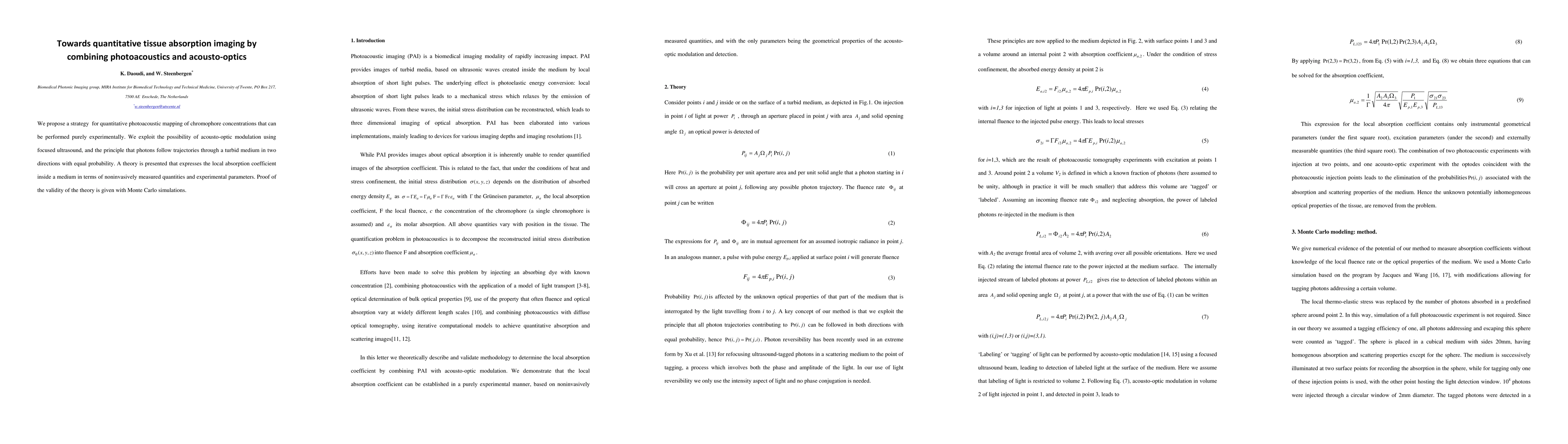 We propose a strategy for quantitative photoacoustic mapping of chromophore concentrations that can be performed purely experimentally. We exploit the possibility of acousto-optic modulation using focused ultrasound, and the principle that photons follow trajectories through a turbid medium in two directions with equal probability. A theory is presented that expresses the local absorption coefficient inside a medium in terms of noninvasively measured quantities and experimental parameters. Proof of the validity of the theory is given with Monte Carlo simulations.