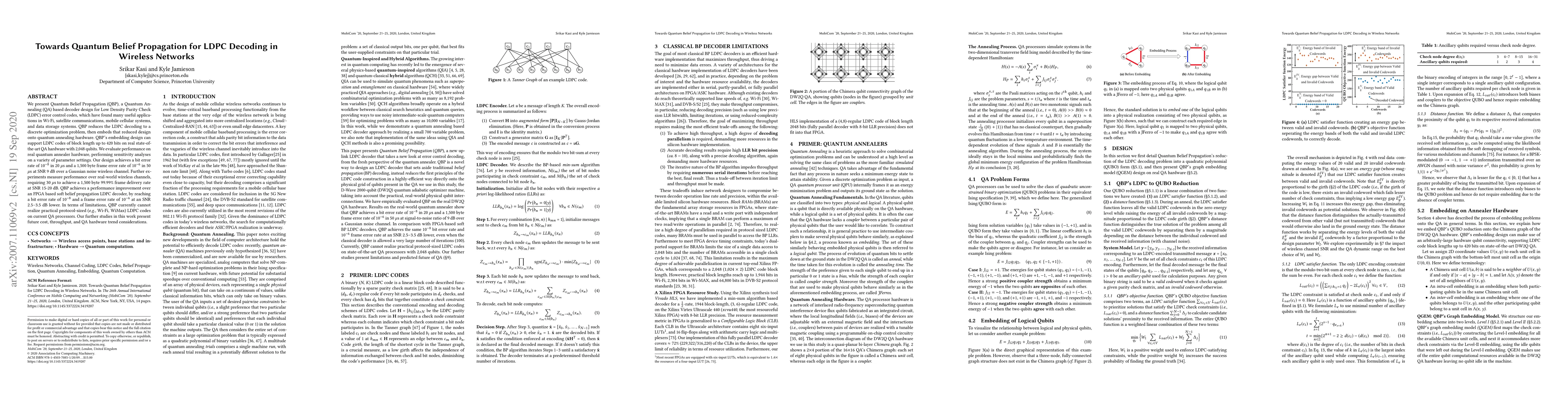 This paper introduces Quantum Belief Propagation (QBP), a quantum annealing-based decoder for Low Density Parity Check (LDPC) codes, achieving significant performance improvements over traditional FPGA-based decoders in wireless networks. Despite its current limitations in handling larger protocol-sized LDPC codes, QBP shows promising results in reducing error rates and improving throughput.