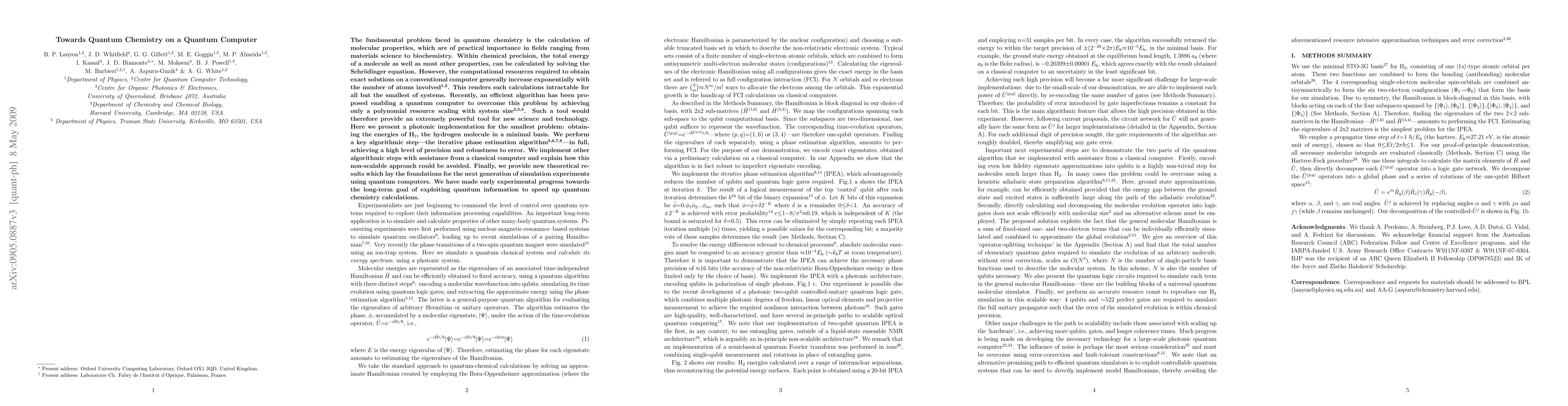 The fundamental problem faced in quantum chemistry is the calculation of molecular properties, which are of practical importance in fields ranging from materials science to biochemistry. Within chemical precision, the total energy of a molecule as well as most other properties, can be calculated by solving the Schrodinger equation. However, the computational resources required to obtain exact solutions on a conventional computer generally increase exponentially with the number of atoms involved. This renders such calculations intractable for all but the smallest of systems. Recently, an efficient algorithm has been proposed enabling a quantum computer to overcome this problem by achieving only a polynomial resource scaling with system size. Such a tool would therefore provide an extremely powerful tool for new science and technology. Here we present a photonic implementation for the smallest problem: obtaining the energies of H2, the hydrogen molecule in a minimal basis. We perform a key algorithmic step - the iterative phase estimation algorithm - in full, achieving a high level of precision and robustness to error. We implement other algorithmic steps with assistance from a classical computer and explain how this non-scalable approach could be avoided. Finally, we provide new theoretical results which lay the foundations for the next generation of simulation experiments using quantum computers. We have made early experimental progress towards the long-term goal of exploiting quantum information to speed up quantum chemistry calculations.