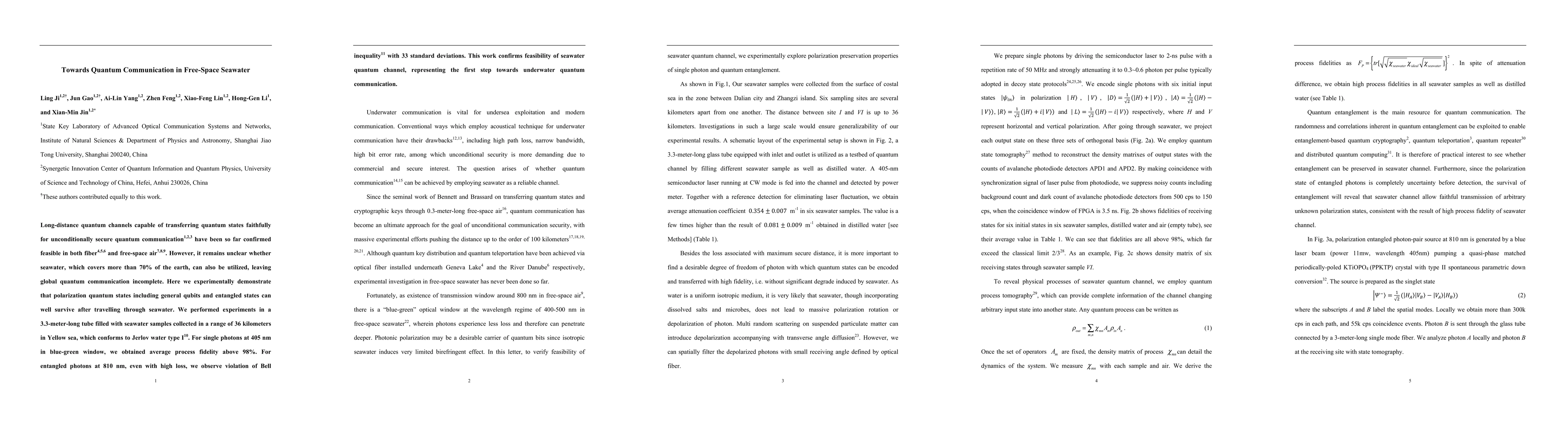This paper experimentally demonstrates that quantum states can survive transmission through seawater, achieving high process fidelity for single photons and significant Bell inequality violation for entangled photons, thus confirming the feasibility of seawater as a quantum communication medium.