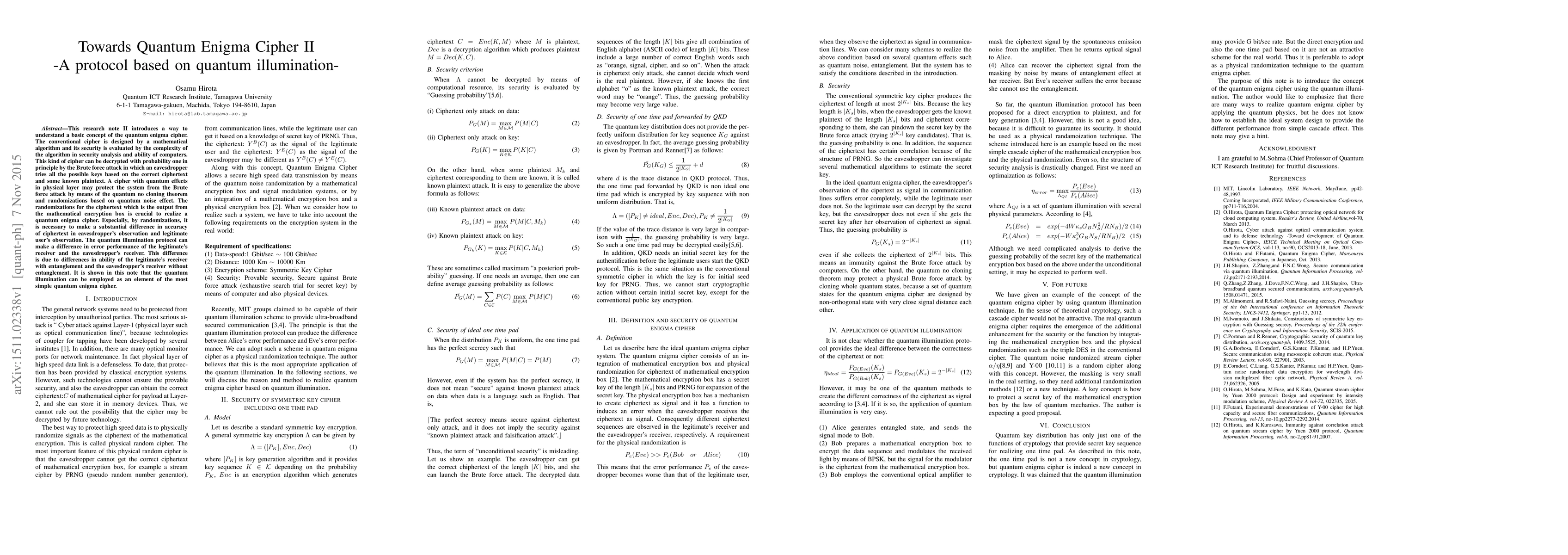 This research note II introduces a way to understand a basic concept of the quantum enigma cipher. The conventional cipher is designed by a mathematical algorithm and its security is evaluated by the complexity of the algorithm in security analysis and ability of computers. This kind of cipher can be decrypted with probability one in principle by the Brute force attack in which an eavesdropper tries all the possible keys based on the correct ciphertext and some known plaintext. A cipher with quantum effects in physical layer may protect the system from the Brute force attack by means of the quantum no cloning theorem and randomizations based on quantum noise effect. The randomizations for the ciphertext which is the output from the mathematical encryption box is crucial to realize a quantum enigma cipher. Especially, by randomizations, it is necessary to make a substantial difference in accuracy of ciphertext in eavesdropper's observation and legitimate user's observation. The quantum illumination protocol can make a difference in error performance of the legitimate's receiver and the eavesdropper's receiver. This difference is due to differences in ability of the legitimate's receiver with entanglement and the eavesdropper's receiver without entanglement. It is shown in this note that the quantum illumination can be employed as an element of the most simple quantum enigma cipher.