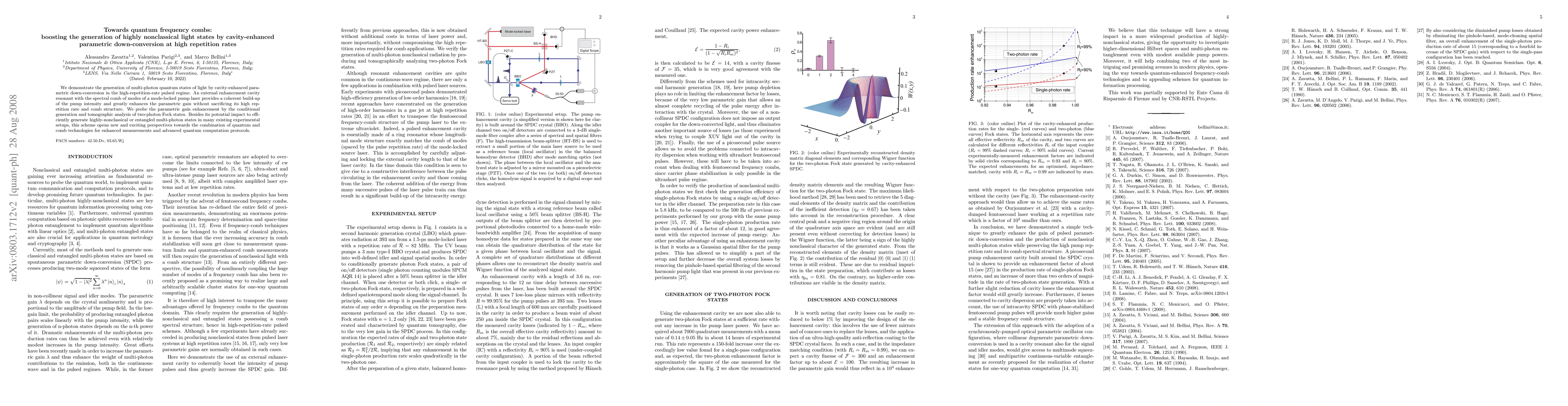 This paper demonstrates the generation of multi-photon quantum states via cavity-enhanced parametric down-conversion at high repetition rates, enhancing the parametric gain while maintaining the comb structure. The method shows potential for generating highly nonclassical light states and advancing quantum computation protocols.