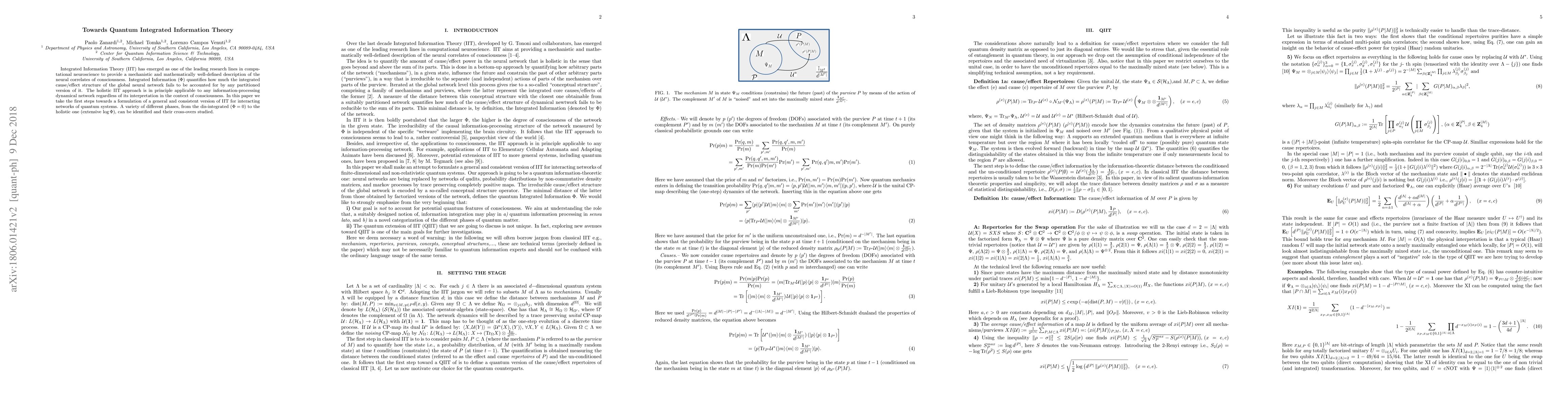 The paper introduces a quantum information-theoretic approach to IIT, encoding the reducible cause/effect structure of global quantum networks via a conceptual structure operator, and defining quantum Integrated Information $\Phi$ as the minimal distance of this operator from factorized versions of the network.