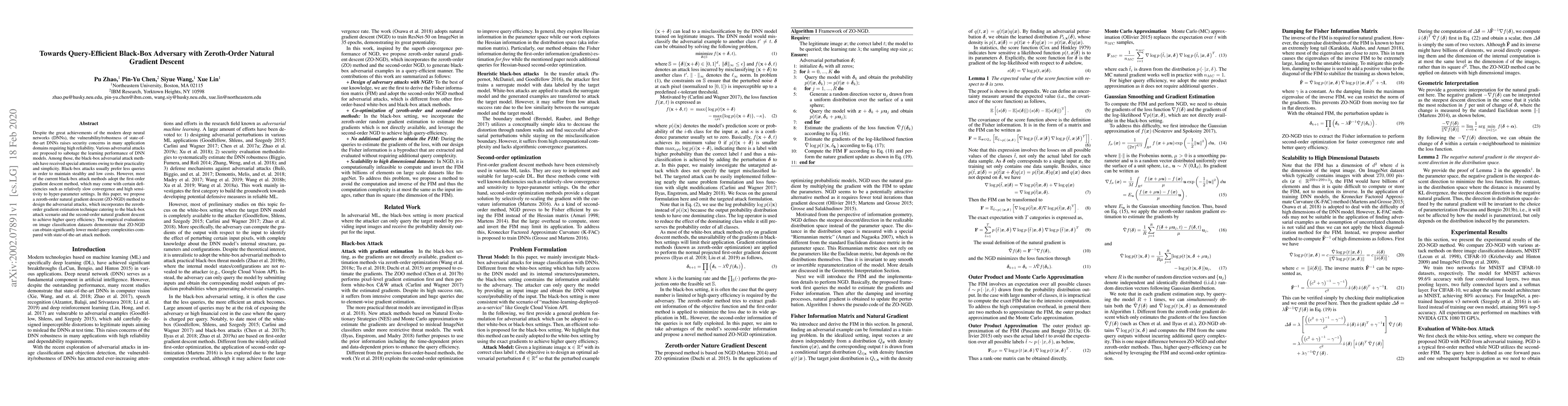 This paper proposes a zeroth-order natural gradient descent (ZO-NGD) method for query-efficient black-box adversarial attacks on deep neural networks. The ZO-NGD method combines zeroth-order gradient estimation and second-order natural gradient descent to achieve higher query efficiency, demonstrating lower model query complexities compared to existing first-order gradient descent methods.