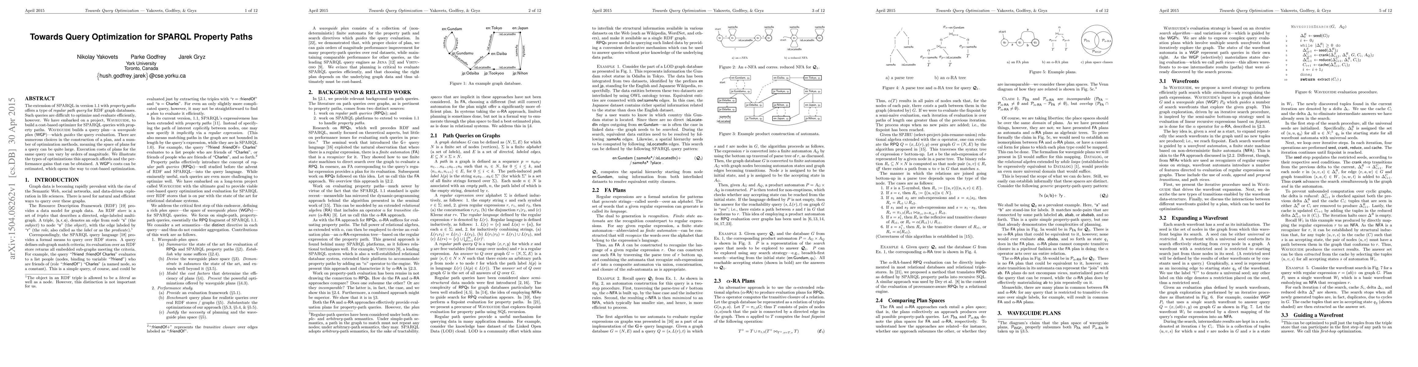 The paper discusses the Waveguide project aimed at optimizing SPARQL queries with property paths by constructing a cost-based waveguide plan (WGP) to efficiently evaluate complex queries. The project demonstrates significant performance gains through various optimization strategies and cost estimation methods.