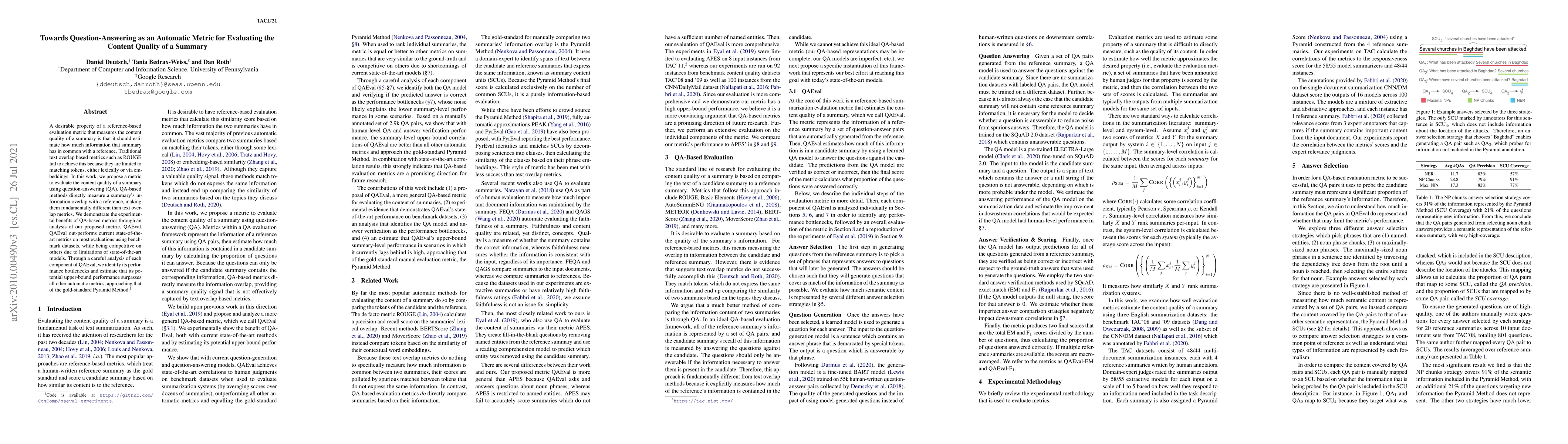 A new metric, QAEval, uses question-answering to evaluate summary content quality, outperforming traditional metrics like ROUGE on most evaluations.