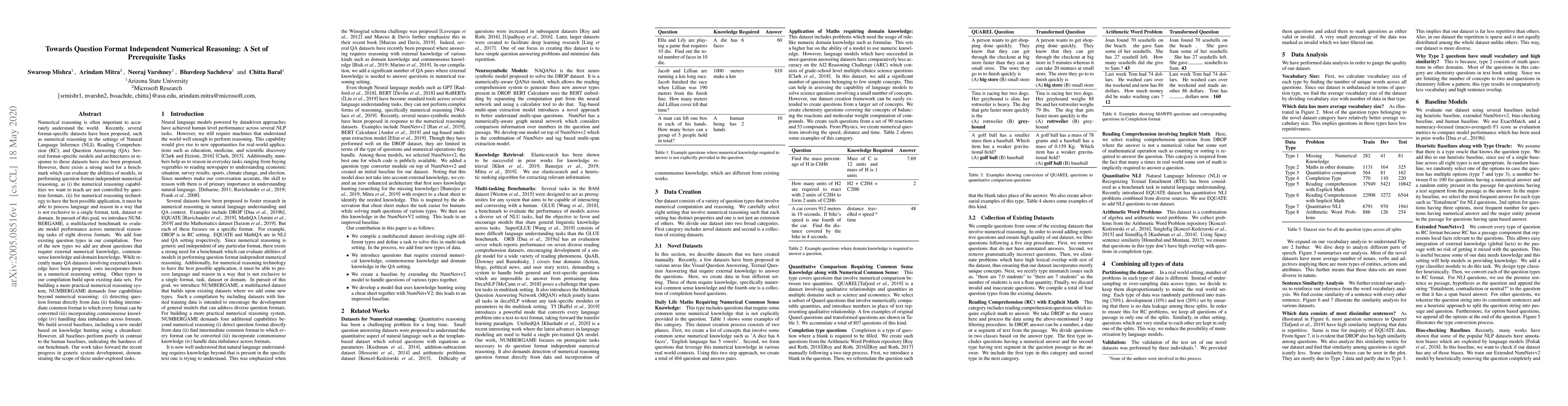 The paper introduces NUMBERGAME, a benchmark for evaluating models in question format independent numerical reasoning across eight diverse formats. It highlights the need for a format-agnostic numerical reasoning system and identifies four essential capabilities: format detection, common format conversion, incorporating commonsense knowledge, and handling data imbalance. Despite building several baselines, including a novel model using a cheatsheet, all baselines underperform human baselines, underscoring the benchmark's difficulty and the potential for future progress in this area.