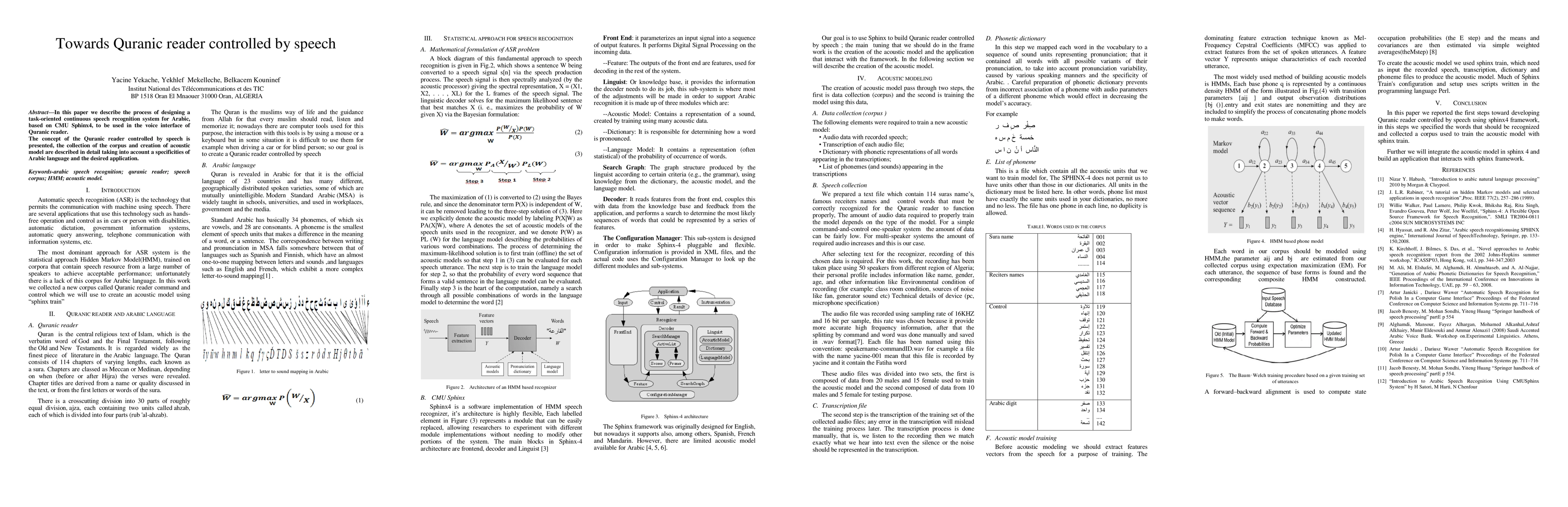 In this paper we describe the process of designing a task-oriented continuous speech recognition system for Arabic, based on CMU Sphinx4, to be used in the voice interface of Quranic reader. The concept of the Quranic reader controlled by speech is presented, the collection of the corpus and creation of acoustic model are described in detail taking into account a specificities of Arabic language and the desired application.