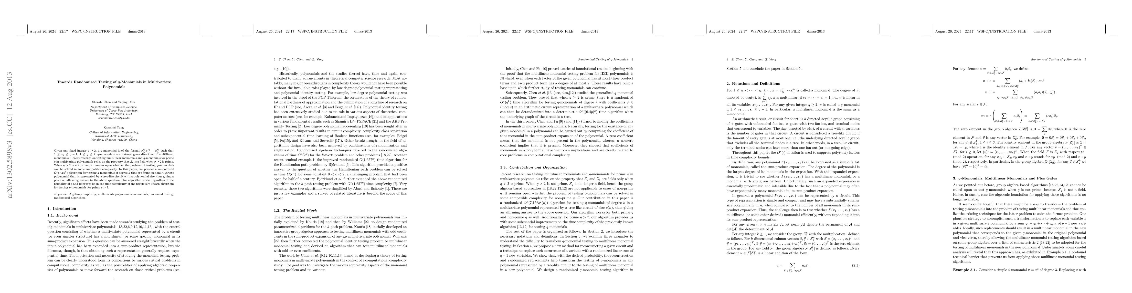 Given any fixed integer $q\ge 2$, a $q$-monomial is of the format $\displaystyle x^{s_1}_{i_1}x^{s_2}_{i_2}...x_{i_t}^{s_t}$ such that $1\le s_j \le q-1$, $1\le j \le t$. $q$-monomials are natural generalizations of multilinear monomials. Recent research on testing multilinear monomials and $q$-monomails for prime $q$ in multivariate polynomials relies on the property that $Z_q$ is a field when $q\ge 2 $ is prime. When $q>2$ is not prime, it remains open whether the problem of testing $q$-monomials can be solved in some compatible complexity. In this paper, we present a randomized $O^*(7.15^k)$ algorithm for testing $q$-monomials of degree $k$ that are found in a multivariate polynomial that is represented by a tree-like circuit with a polynomial size, thus giving a positive, affirming answer to the above question. Our algorithm works regardless of the primality of $q$ and improves upon the time complexity of the previously known algorithm for testing $q$-monomials for prime $q>7$.