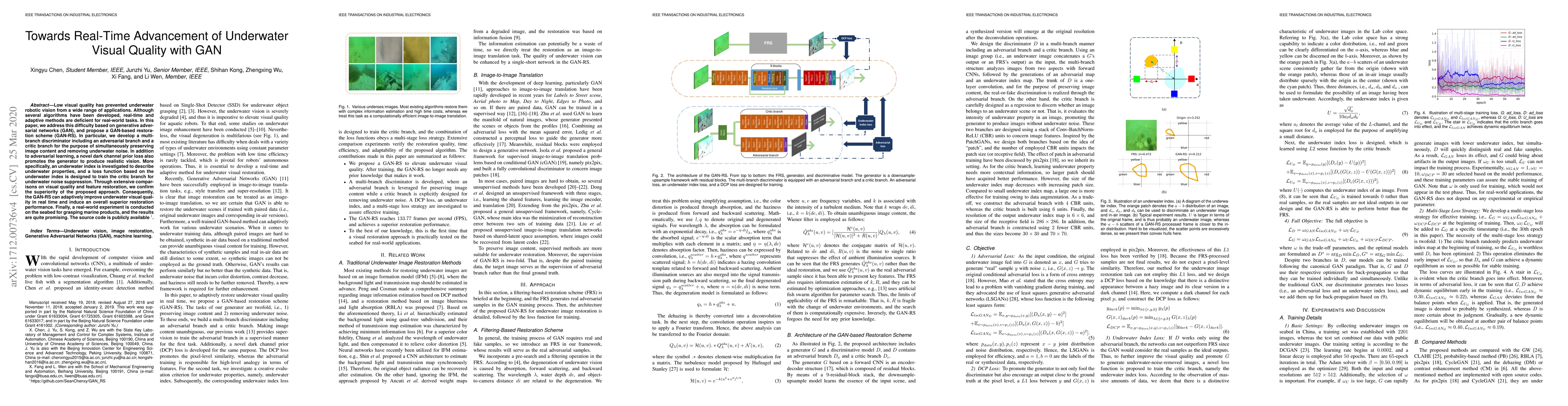This paper proposes a GAN-based restoration scheme (GAN-RS) to enhance real-time underwater visual quality by using a multi-branch discriminator and a novel dark channel prior loss. The method demonstrates superior performance in underwater noise suppression and adaptive image restoration, validated through both synthetic and real-world experiments.