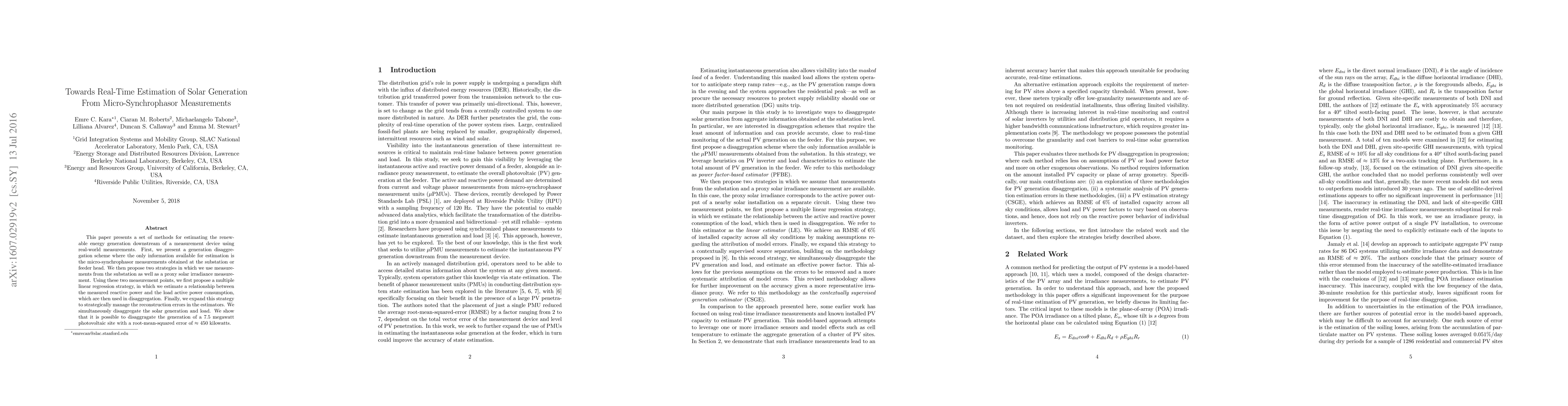 This paper develops methods for real-time estimation of solar energy generation using micro-synchrophasor measurements and proxy solar irradiance data, achieving a 450 kW RMSE in disaggregating a 7.5 MW photovoltaic site. It employs multiple linear regression and error management strategies for accurate estimation.