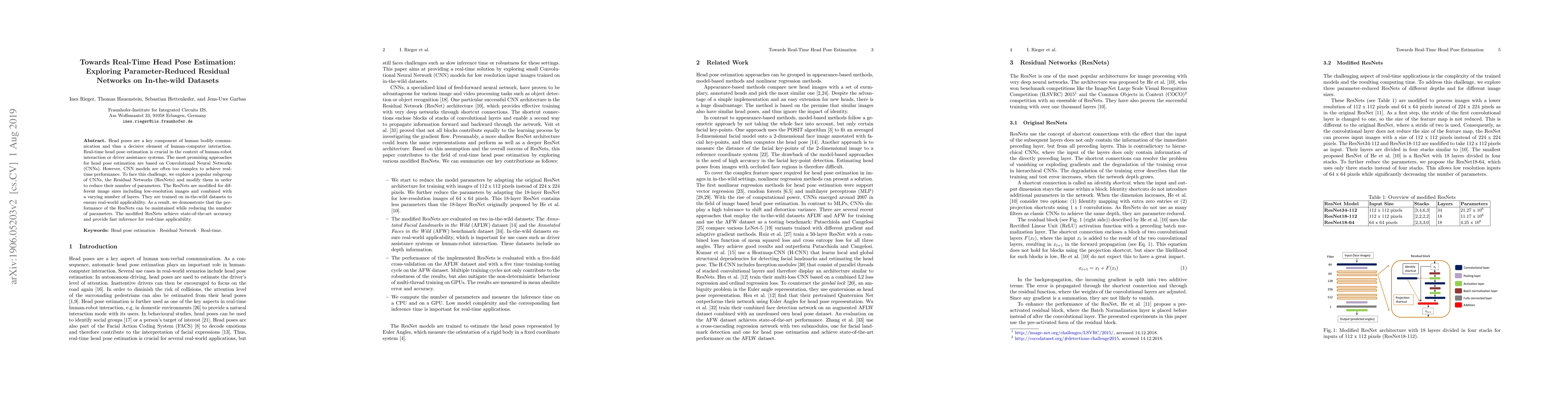 Head poses are a key component of human bodily communication and thus a decisive element of human-computer interaction. Real-time head pose estimation is crucial in the context of human-robot interaction or driver assistance systems. The most promising approaches for head pose estimation are based on Convolutional Neural Networks (CNNs). However, CNN models are often too complex to achieve real-time performance. To face this challenge, we explore a popular subgroup of CNNs, the Residual Networks (ResNets) and modify them in order to reduce their number of parameters. The ResNets are modifed for different image sizes including low-resolution images and combined with a varying number of layers. They are trained on in-the-wild datasets to ensure real-world applicability. As a result, we demonstrate that the performance of the ResNets can be maintained while reducing the number of parameters. The modified ResNets achieve state-of-the-art accuracy and provide fast inference for real-time applicability.