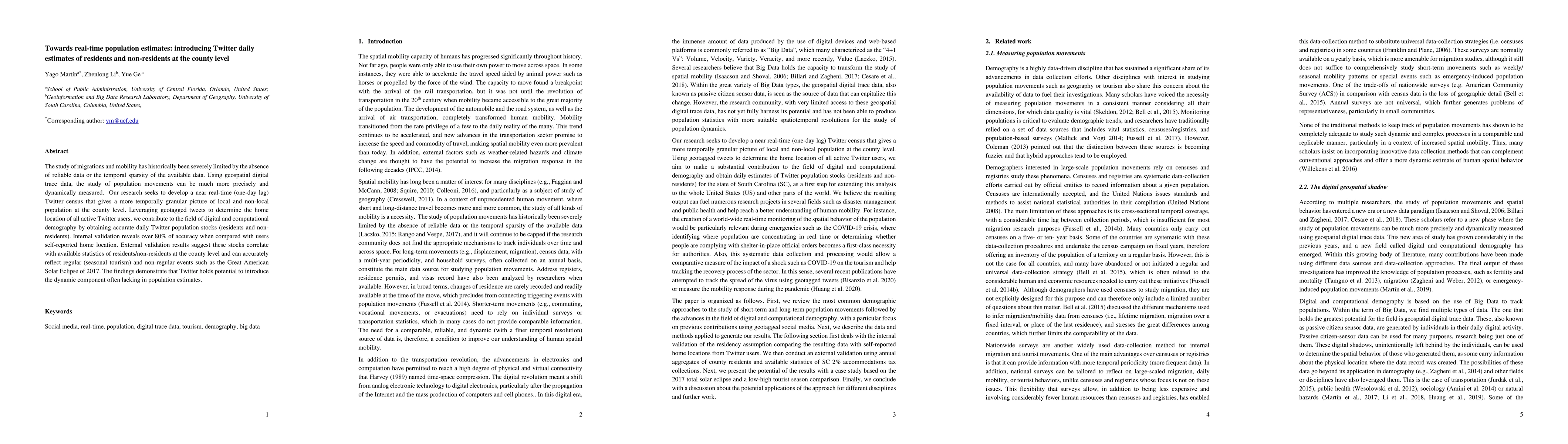 The study of migrations and mobility has historically been severely limited by the absence of reliable data or the temporal sparsity of the available data. Using geospatial digital trace data, the study of population movements can be much more precisely and dynamically measured. Our research seeks to develop a near real-time (one-day lag) Twitter census that gives a more temporally granular picture of local and non-local population at the county level. Leveraging geotagged tweets to determine the home location of all active Twitter users, we contribute to the field of digital and computational demography by obtaining accurate daily Twitter population stocks (residents and non-residents). Internal validation reveals over 80% of accuracy when compared with users self-reported home location. External validation results suggest these stocks correlate with available statistics of residents/non-residents at the county level and can accurately reflect regular (seasonal tourism) and non-regular events such as the Great American Solar Eclipse of 2017. The findings demonstrate that Twitter holds potential to introduce the dynamic component often lacking in population estimates.