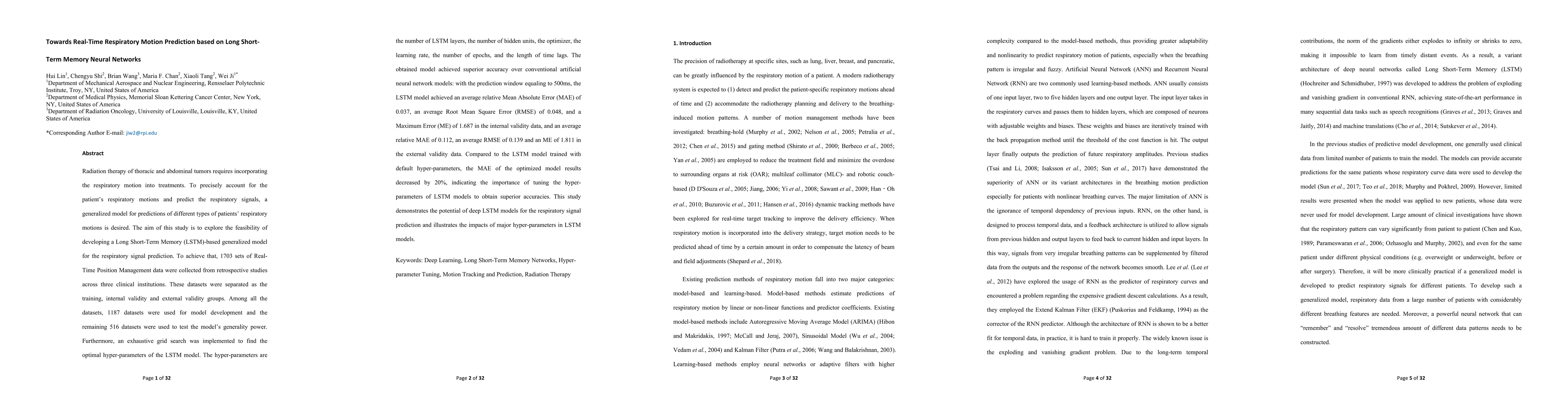 Radiation therapy of thoracic and abdominal tumors requires incorporating the respiratory motion into treatments. To precisely account for the patient respiratory motions and predict the respiratory signals, a generalized model for predictions of different types of respiratory motions is desired. The aim of this study is to explore the feasibility of developing a Long Short-Term Memory (LSTM)-based model for the respiratory signal prediction. To achieve that, 1703 sets of Real-Time Position Management data were collected from retrospective studies across three clinical institutions. These datasets were separated as the training, internal validity and external validity groups. 1187 datasets were used for model development and the remaining 516 datasets were used to test the generality power of the model. Furthermore, an exhaustive grid search was implemented to find the optimal hyper-parameters of the LSTM model. The hyper-parameters are the number of LSTM layers, the number of hidden units, the optimizer, the learning rate, the number of epochs, and the length of time lags. Our model achieved superior accuracy over conventional artificial neural network models: with a prediction window of 500ms, the LSTM model achieved an average relative Mean Absolute Error (MAE) of 0.037, an average Root Mean Square Error (RMSE) of 0.048, and a Maximum Error (ME) of 1.687 in the internal validity data, and an average relative MAE of 0.112, an average RMSE of 0.139 and an ME of 1.811 in the external validity data. Compared to the LSTM model trained with default hyper-parameters, the MAE of the optimized model results decreased by 20%, indicating the importance of tuning the hyper-parameters of LSTM models to obtain superior accuracy. This study demonstrates the potential of deep LSTM models for the respiratory signal prediction and illustrates the impacts of major hyper-parameters in LSTM models.