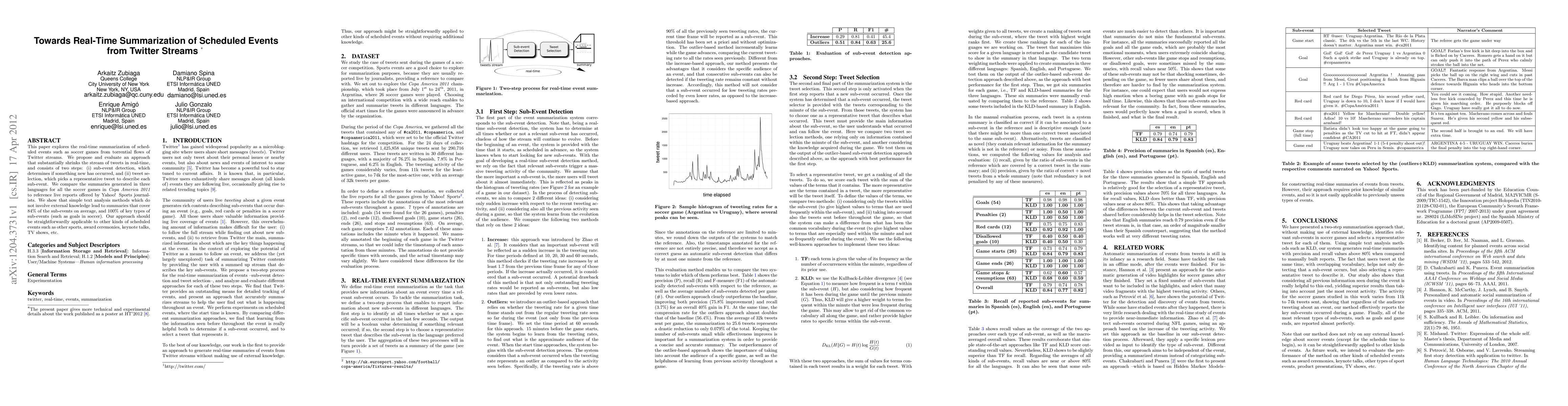 This paper proposes a real-time summarization method for scheduled events from Twitter streams, using sub-event detection and tweet selection. The approach achieves 84% coverage of sub-events and 100% for key types like soccer goals, demonstrating its applicability to various scheduled events.