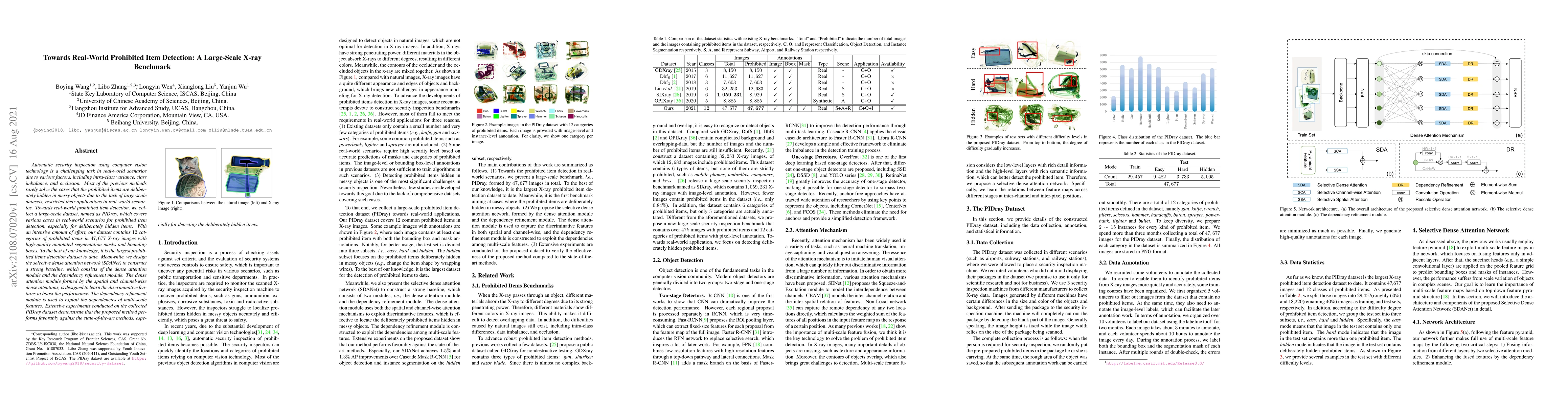 This paper introduces PIDray, a large-scale X-ray dataset for real-world prohibited item detection, addressing challenges like intra-class variance and occlusion. It also proposes a selective dense attention network (SDANet) with dense attention and dependency refinement modules to enhance detection performance, particularly for hidden items.