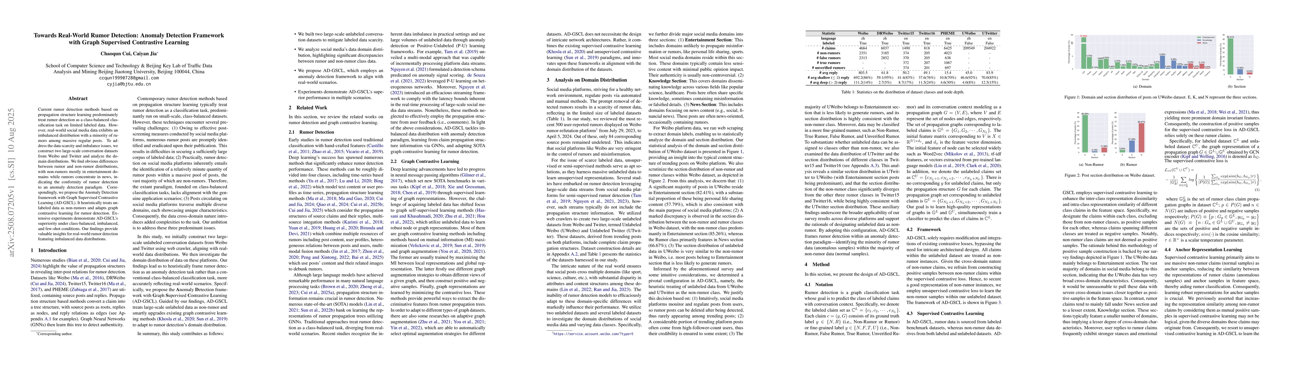 Current rumor detection methods based on propagation structure learning predominately treat rumor detection as a class-balanced classification task on limited labeled data. However, real-world social media data exhibits an imbalanced distribution with a minority of rumors among massive regular posts. To address the data scarcity and imbalance issues, we construct two large-scale conversation datasets from Weibo and Twitter and analyze the domain distributions. We find obvious differences between rumor and non-rumor distributions, with non-rumors mostly in entertainment domains while rumors concentrate in news, indicating the conformity of rumor detection to an anomaly detection paradigm. Correspondingly, we propose the Anomaly Detection framework with Graph Supervised Contrastive Learning (AD-GSCL). It heuristically treats unlabeled data as non-rumors and adapts graph contrastive learning for rumor detection. Extensive experiments demonstrate AD-GSCL's superiority under class-balanced, imbalanced, and few-shot conditions. Our findings provide valuable insights for real-world rumor detection featuring imbalanced data distributions.