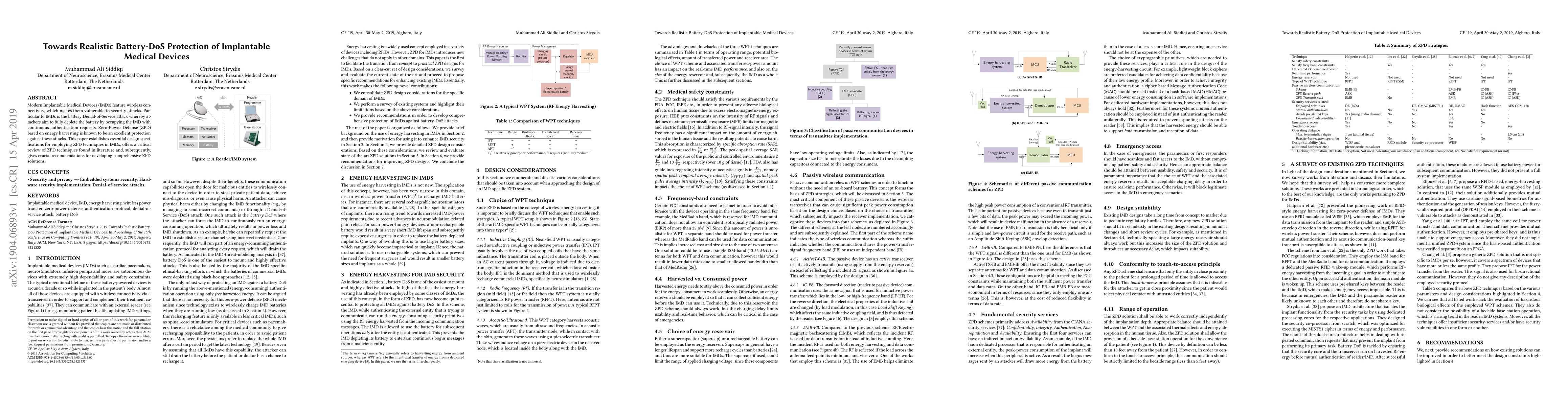 Modern Implantable Medical Devices (IMDs) feature wireless connectivity, which makes them vulnerable to security attacks. Particular to IMDs is the battery Denial-of-Service attack whereby attackers aim to fully deplete the battery by occupying the IMD with continuous authentication requests. Zero-Power Defense (ZPD) based on energy harvesting is known to be an excellent protection against these attacks. This paper establishes essential design specifications for employing ZPD techniques in IMDs, offers a critical review of ZPD techniques found in literature and, subsequently, gives crucial recommendations for developing comprehensive ZPD solutions.