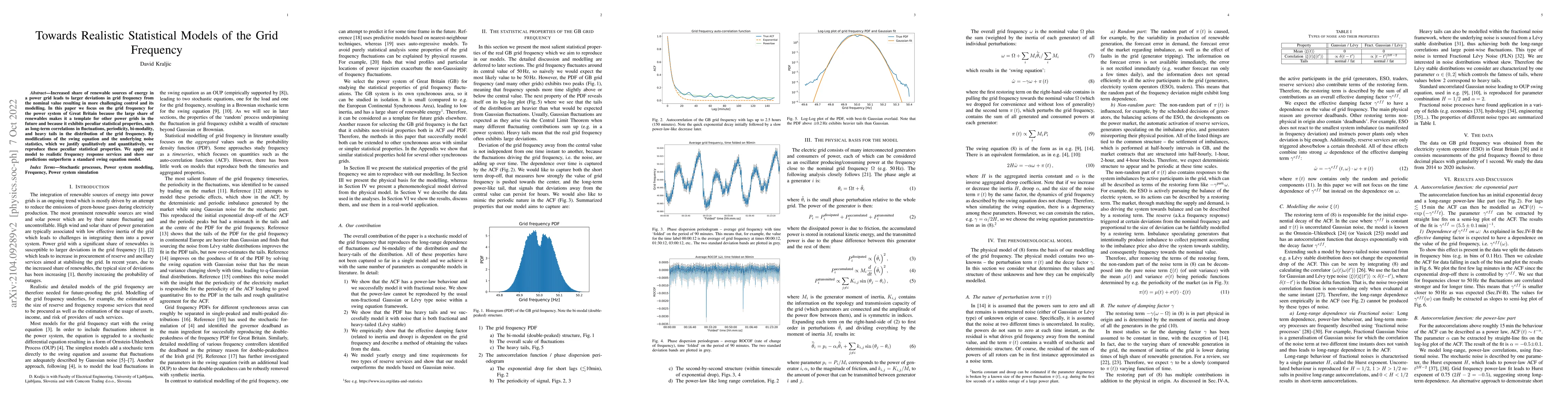 Increased share of renewable sources of energy in a power grid leads to larger deviations in grid frequency from the nominal value resulting in more challenging control and its modelling. In this paper we focus on the grid frequency for the power system of Great Britain because the large share of renewables makes it a template for other power grids in the future and because it exhibits peculiar statistical properties, such as long-term correlations in fluctuations, periodicity, bi-modality,and heavy tails in the distribution of the grid frequency. By modifications of the swing equation and the underlying noise statistics, which we justify qualitatively and quantitatively, we reproduce these peculiar statistical properties. We apply our model to realistic frequency response services and show our predictions outperform a standard swing equation model.