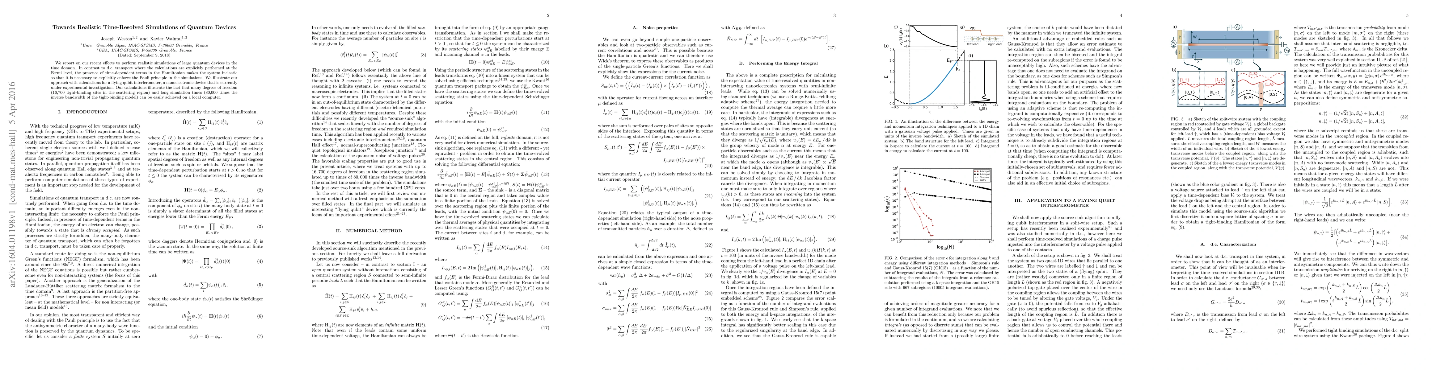 We report on our recent efforts to perform realistic simulations of large quantum devices in the time domain. In contrast to d.c. transport where the calculations are explicitly performed at the Fermi level, the presence of time-dependent terms in the Hamiltonian makes the system inelastic so that it is necessary to explicitly enforce the Pauli principle in the simulations. We illustrate our approach with calculations for a flying qubit interferometer, a nanoelectronic device that is currently under experimental investigation. Our calculations illustrate the fact that many degrees of freedom (16,700 tight-binding sites in the scattering region) and long simulation times (80,000 times the inverse Bandwidth of the tight-binding model) can be easily achieved on a local computer.