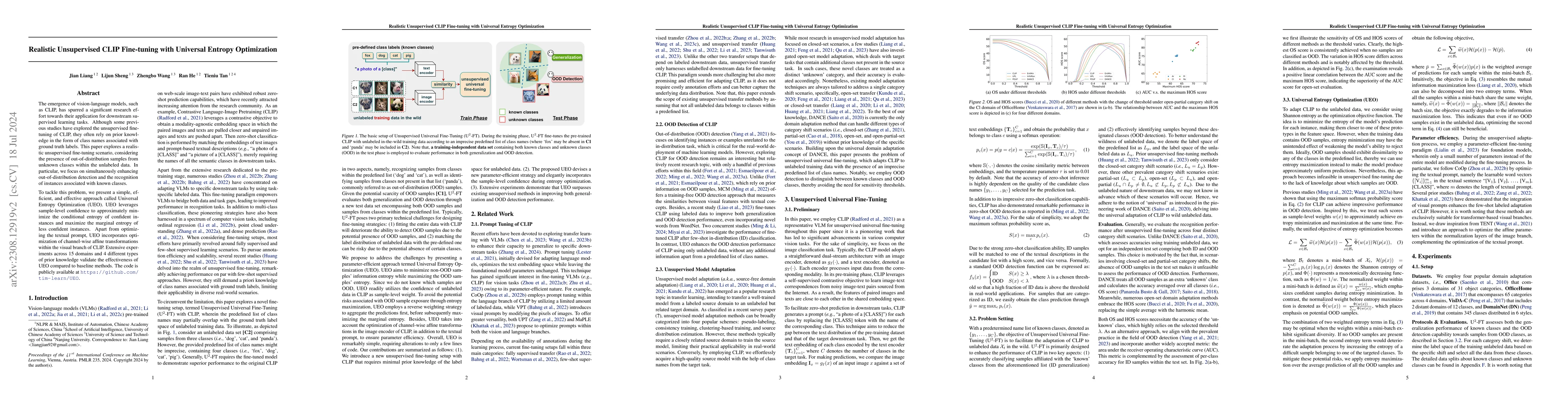 This paper introduces Universal Entropy Optimization (UEO) for unsupervised fine-tuning of CLIP, focusing on enhancing both generalization and out-of-distribution detection in the absence of labeled data. UEO optimizes textual prompts and visual branch transformations based on instance confidence, outperforming baseline methods in multiple domains.