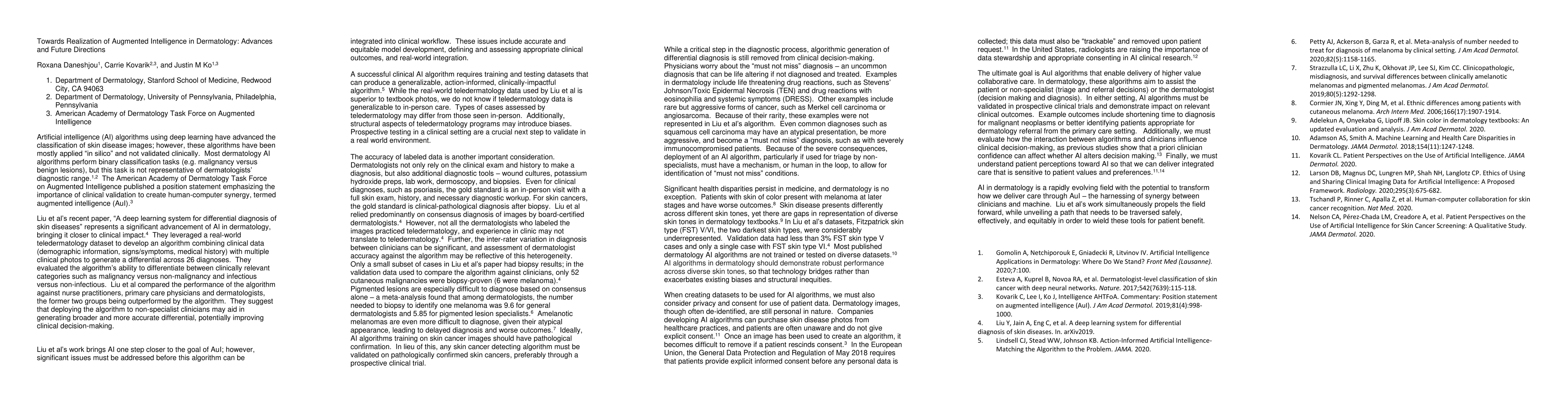 Artificial intelligence (AI) algorithms using deep learning have advanced the classification of skin disease images; however these algorithms have been mostly applied "in silico" and not validated clinically. Most dermatology AI algorithms perform binary classification tasks (e.g. malignancy versus benign lesions), but this task is not representative of dermatologists' diagnostic range. The American Academy of Dermatology Task Force on Augmented Intelligence published a position statement emphasizing the importance of clinical validation to create human-computer synergy, termed augmented intelligence (AuI). Liu et al's recent paper, "A deep learning system for differential diagnosis of skin diseases" represents a significant advancement of AI in dermatology, bringing it closer to clinical impact. However, significant issues must be addressed before this algorithm can be integrated into clinical workflow. These issues include accurate and equitable model development, defining and assessing appropriate clinical outcomes, and real-world integration.