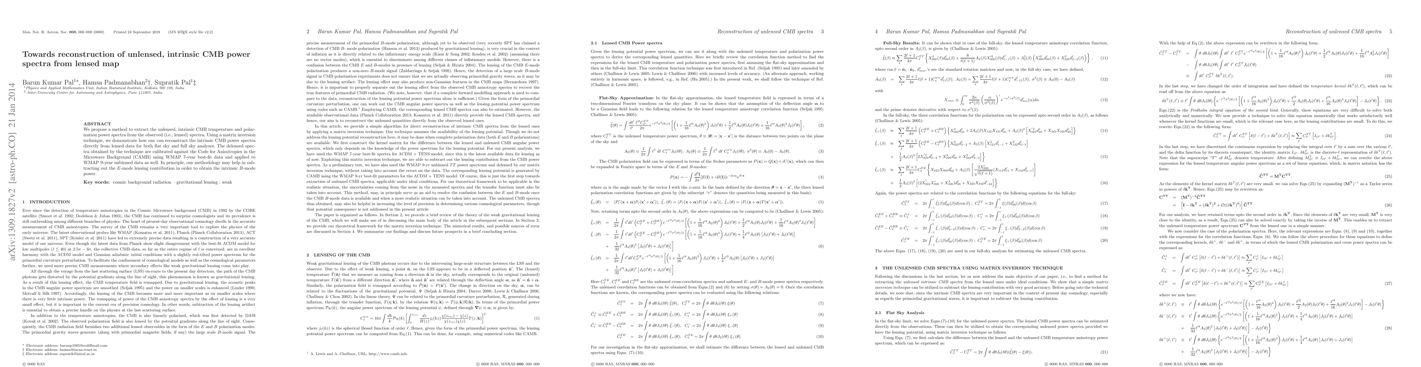 The paper proposes a matrix inversion technique to reconstruct unlensed, intrinsic CMB temperature and polarization power spectra directly from lensed data, applicable for both flat sky and full sky analyses. This methodology is calibrated against CAMB using WMAP 7-year best-fit data and applied to WMAP 9-year unbinned data.